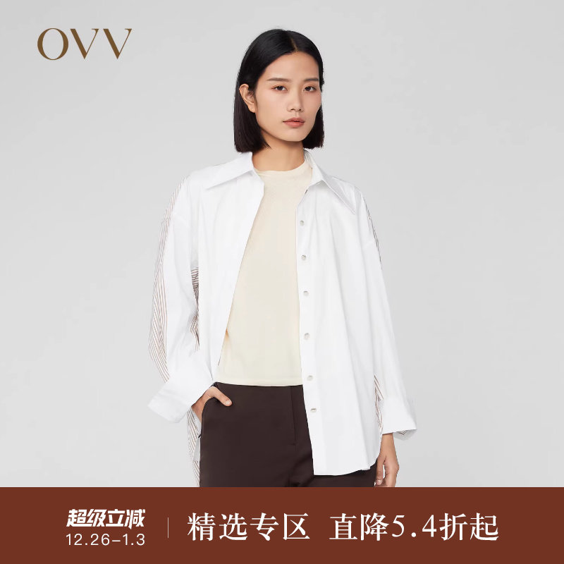 OVV Outlet 秋冬新女条纹拼接撞色纽扣纸片廓形棉感长袖休闲衬衫