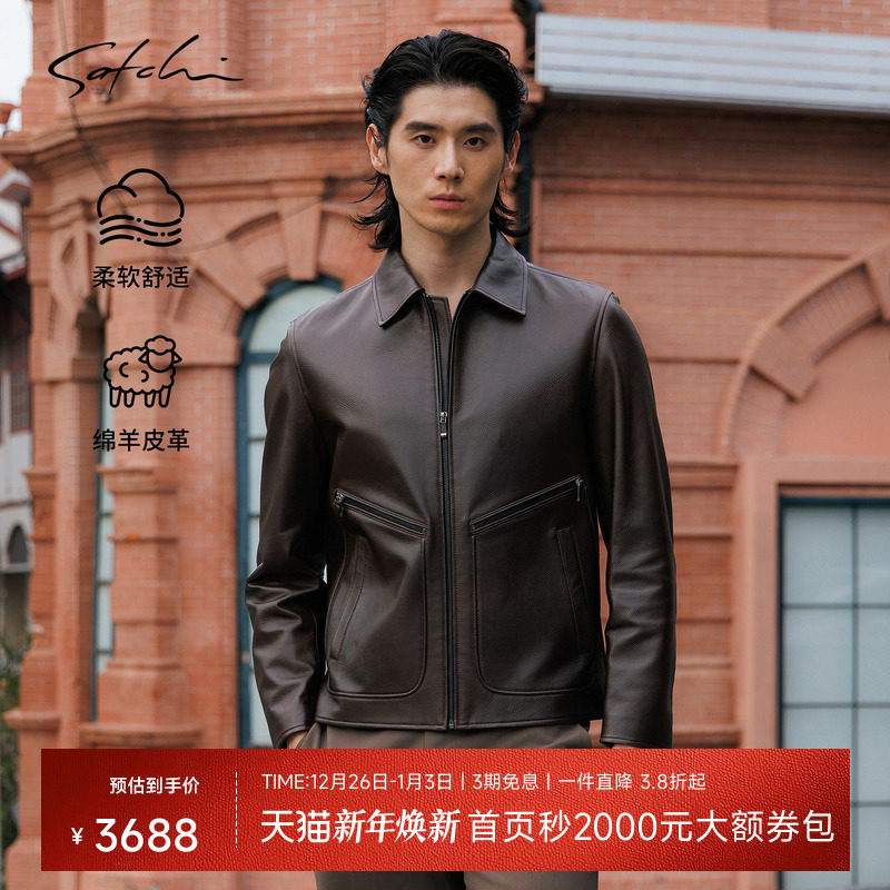 [绵羊皮]SATCHI沙驰男装男士真皮皮衣冬季新款复古机车皮夹克外套