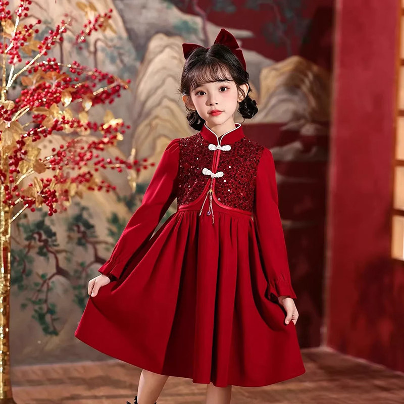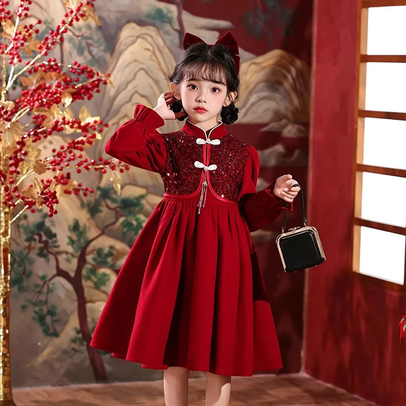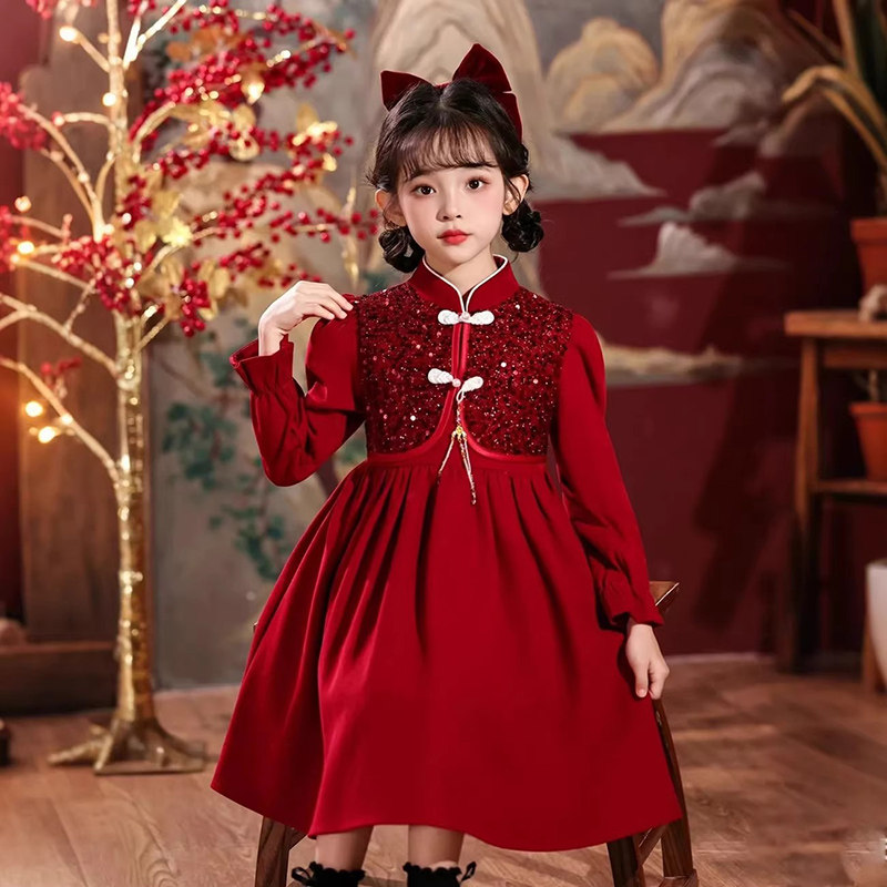 女童冬装裙子过年服2026新款儿童洋气红色连衣裙女孩新年战袍喜庆