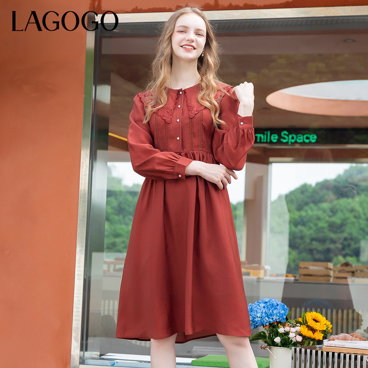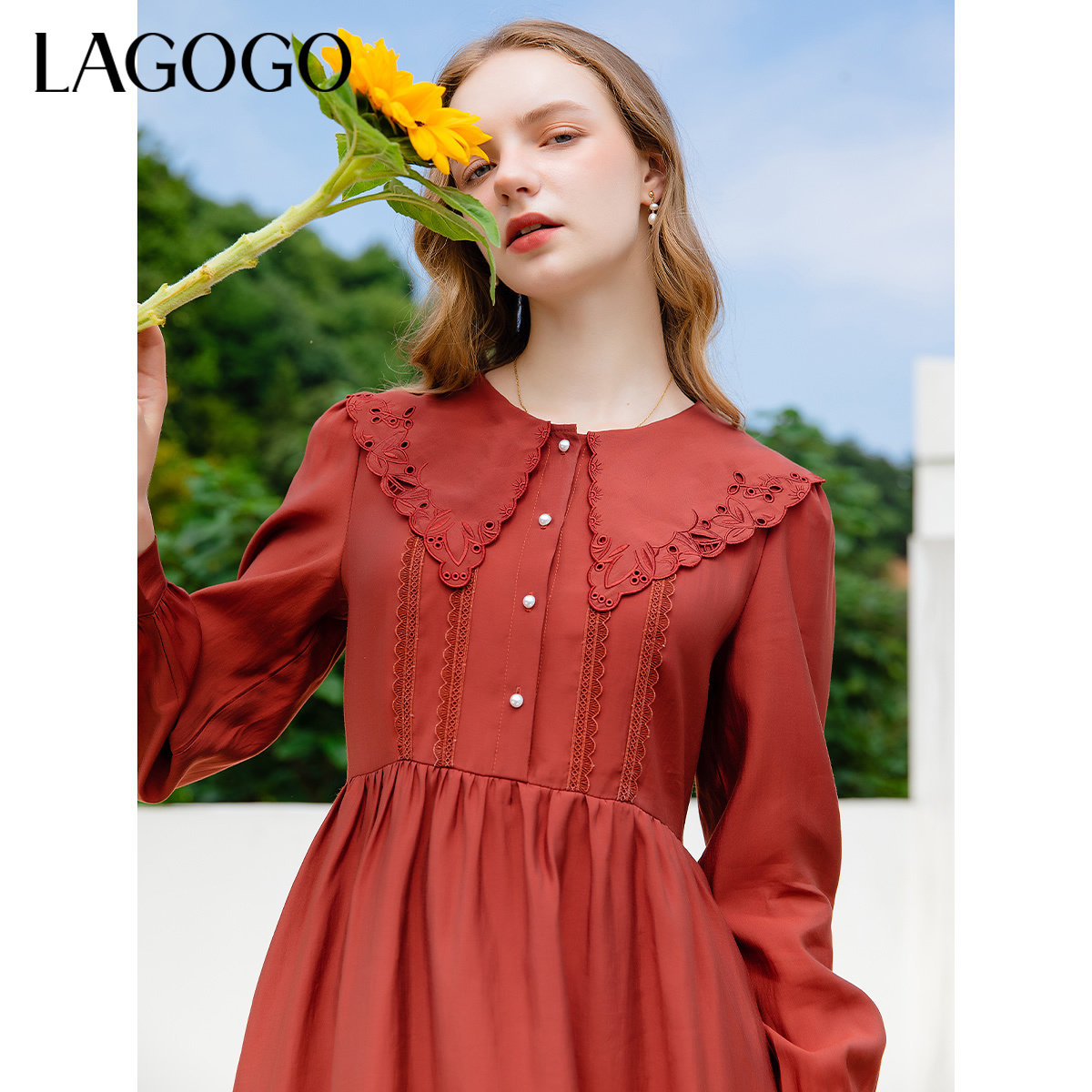LAGOGO酒红色复古风连衣裙女拉谷谷秋冬新款娃娃领系带长袖裙子