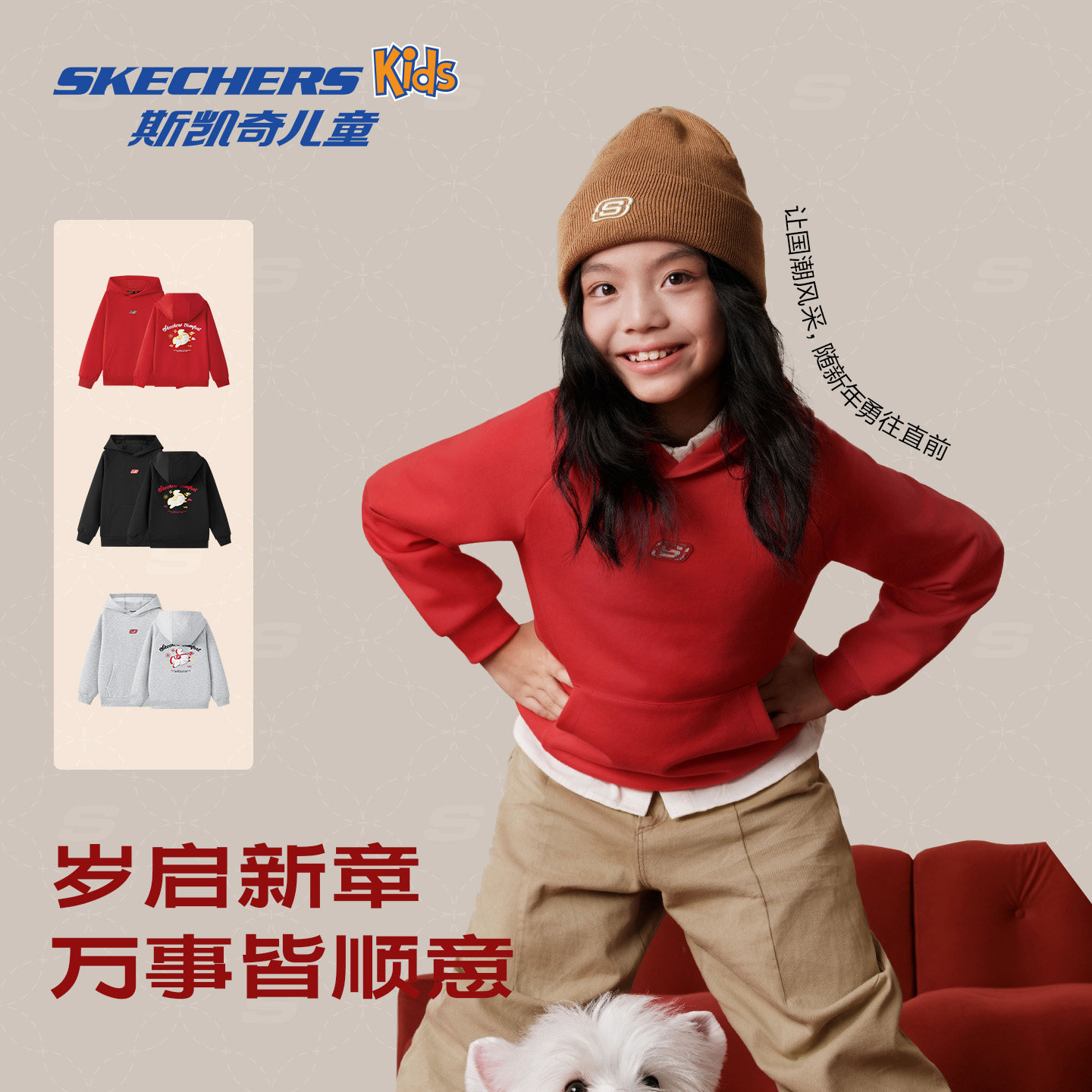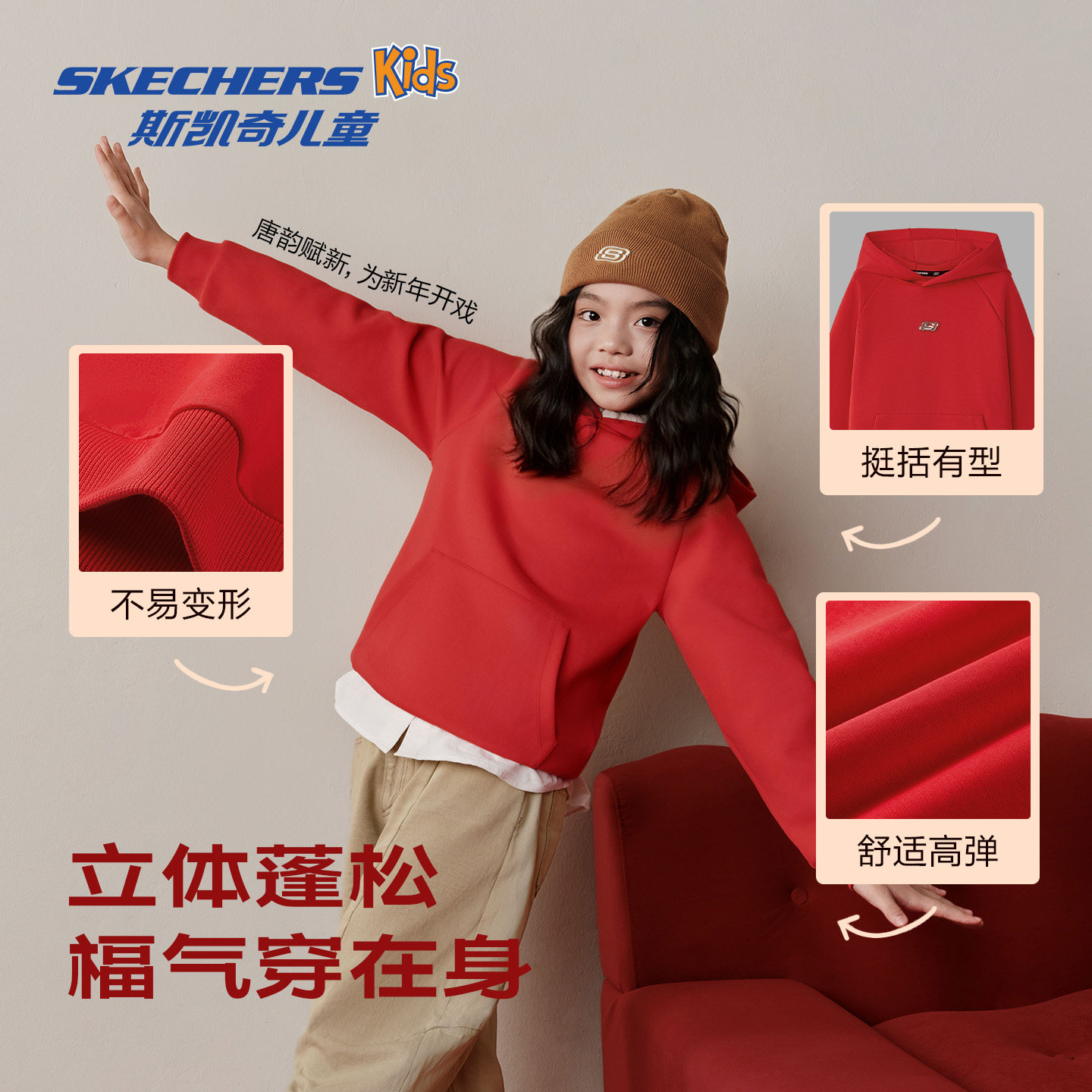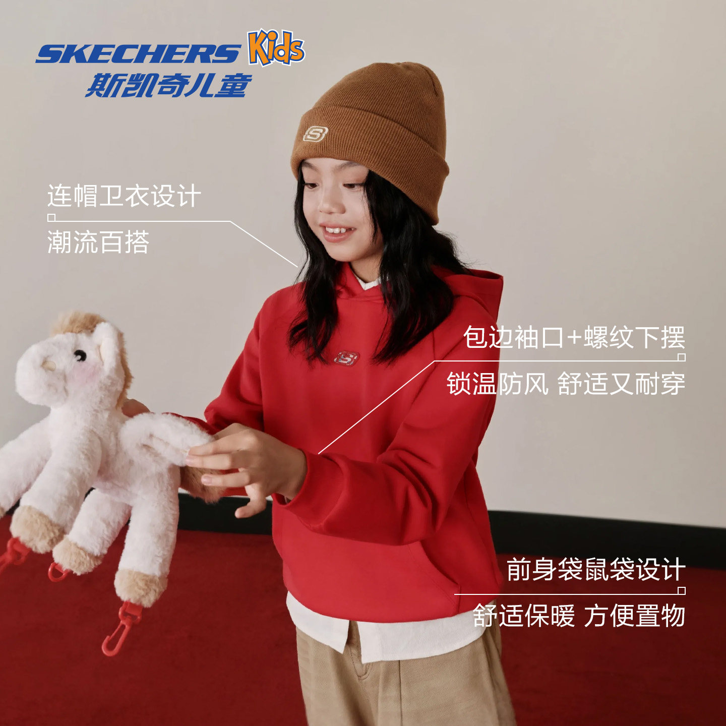 斯凯奇连帽卫衣男女同款针织连帽套头柔软国潮百搭长袖童装绒衫