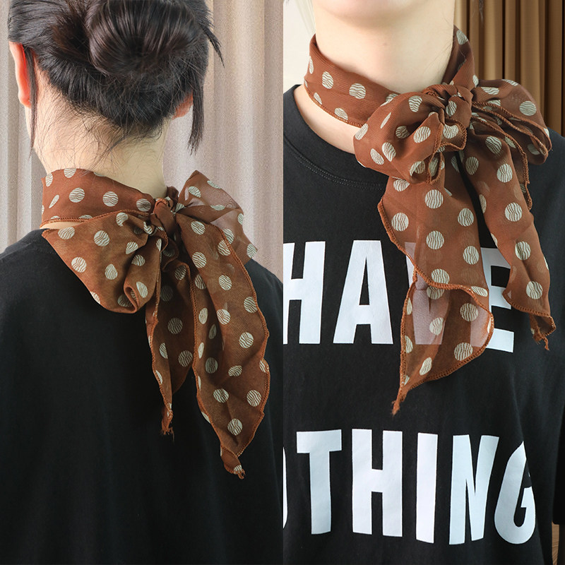 棕色法式复古波点丝巾印花高级脖女气质新款领巾百搭发带长条围巾