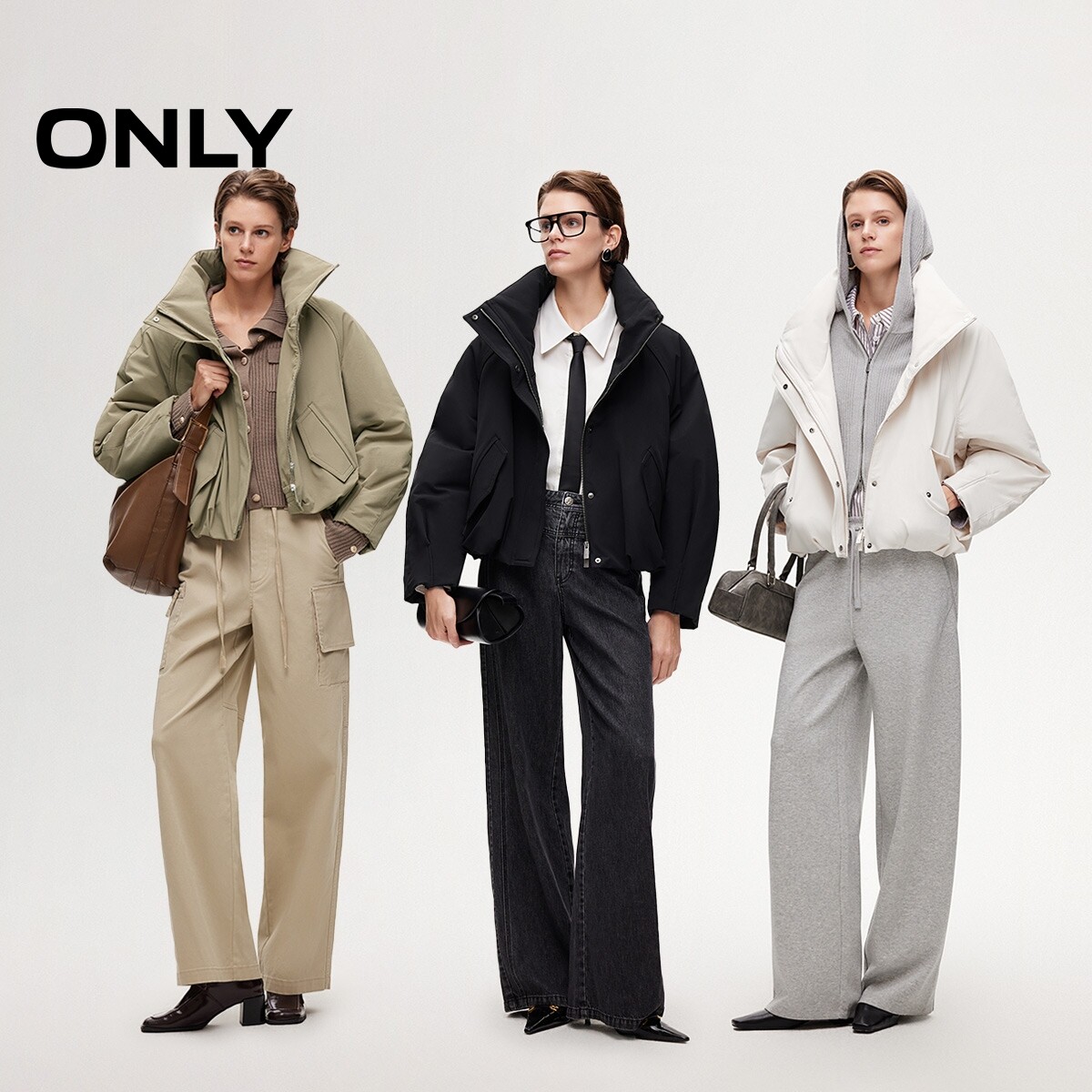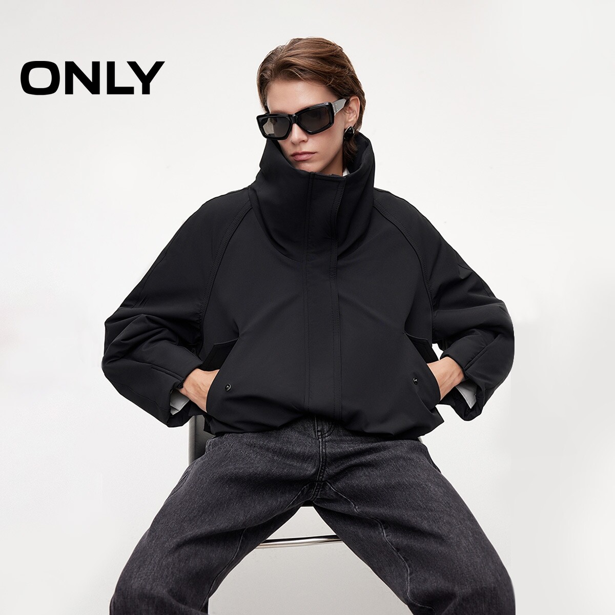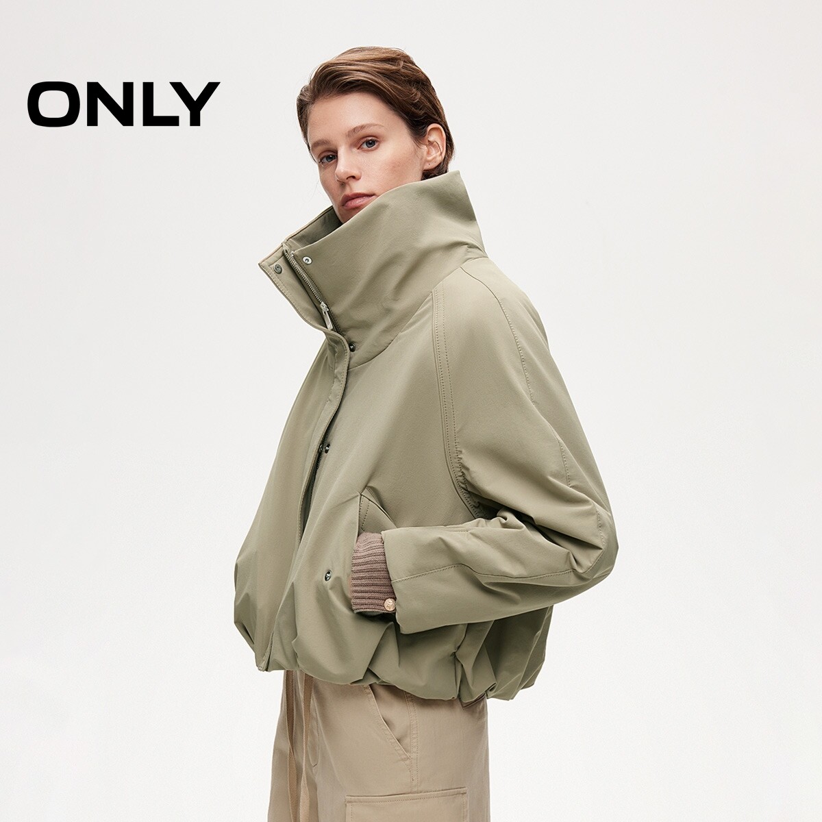 ONLY挺括立领纯色保暖花苞造型下摆双向拉链棉服女