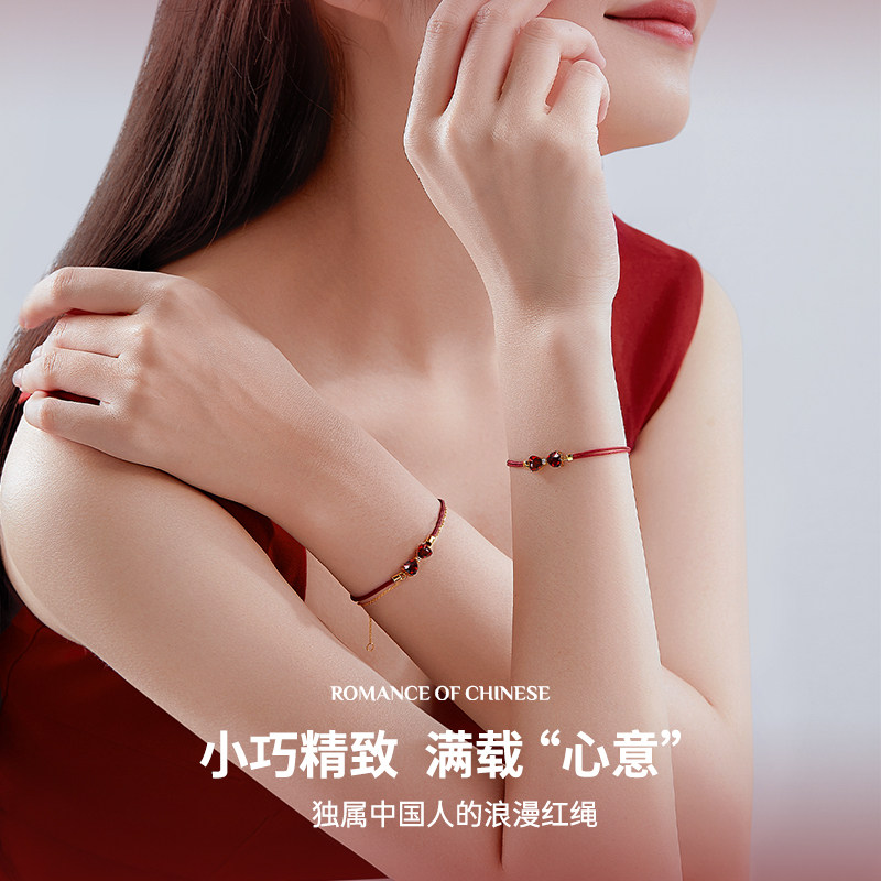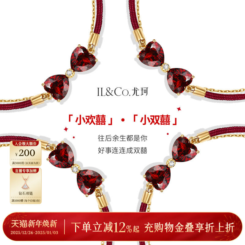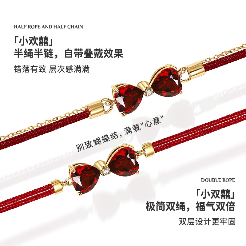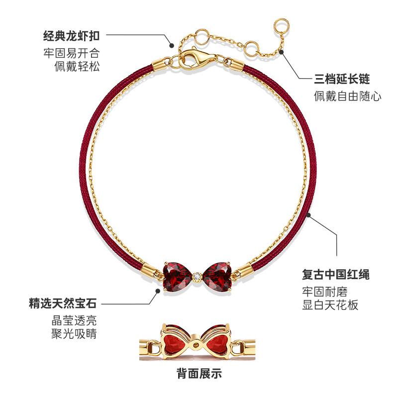 尤珂「小欢囍」18K金天然石榴石手链红色宝石蝴蝶结本命年小红绳