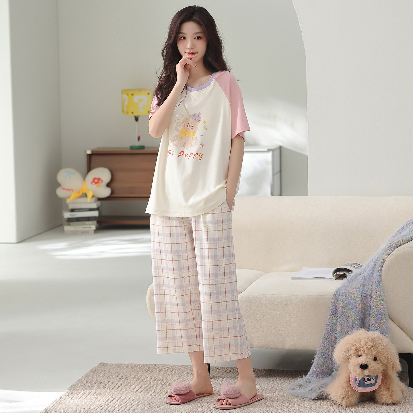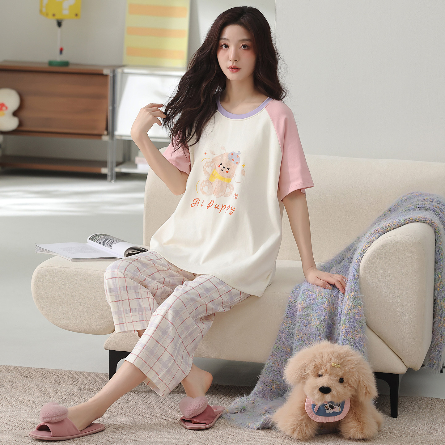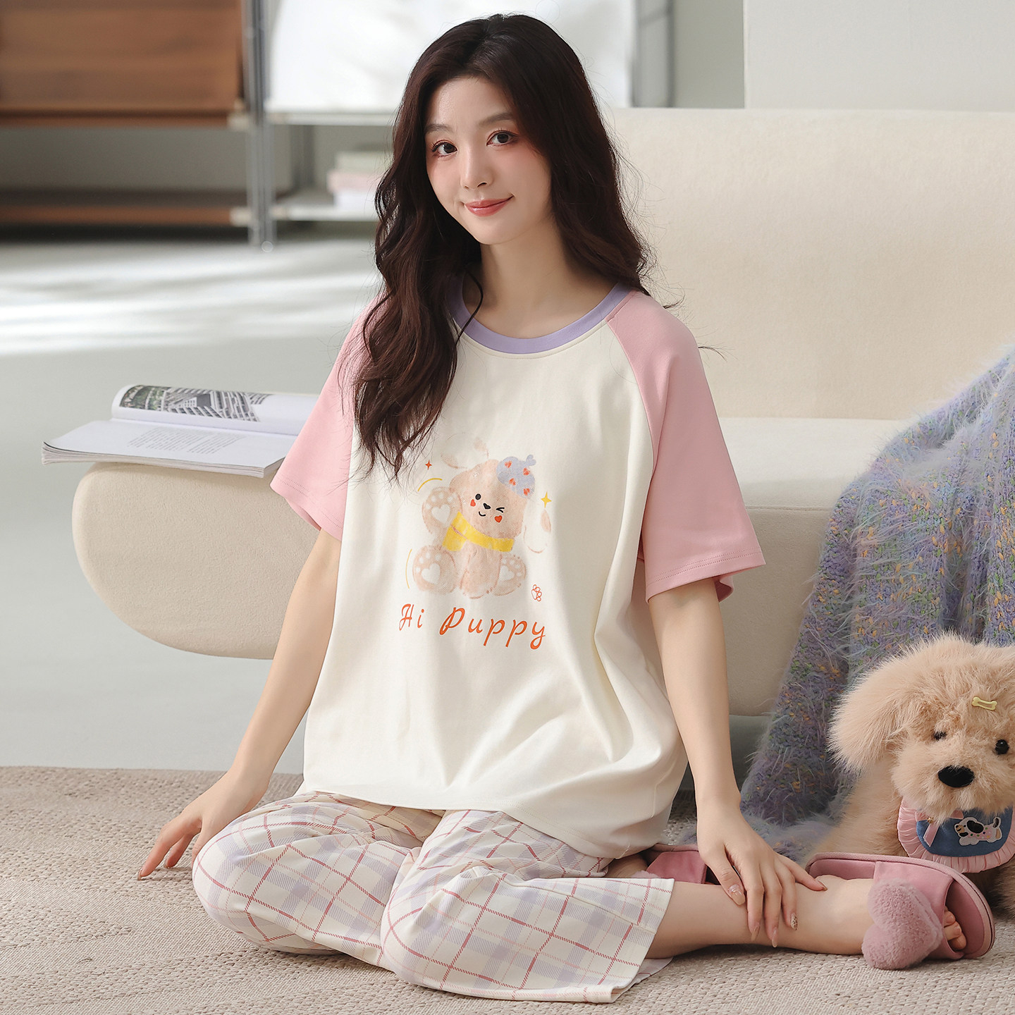 夏季纯棉睡衣女短袖七分裤带胸垫卡通可外穿家居服柔软亲肤薄款