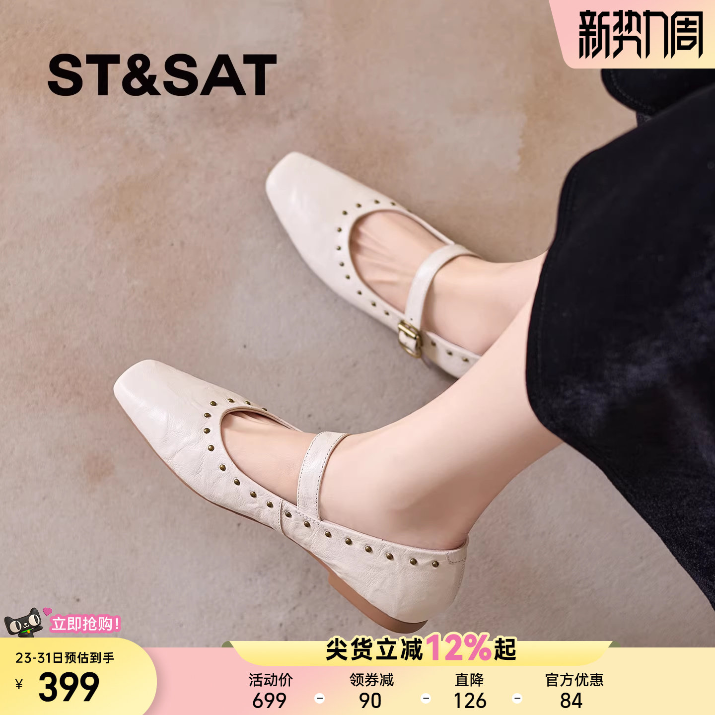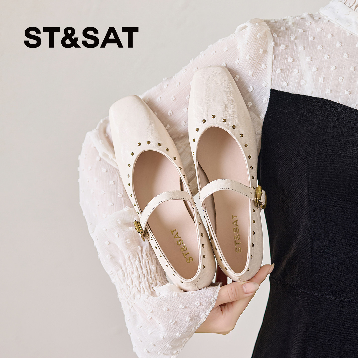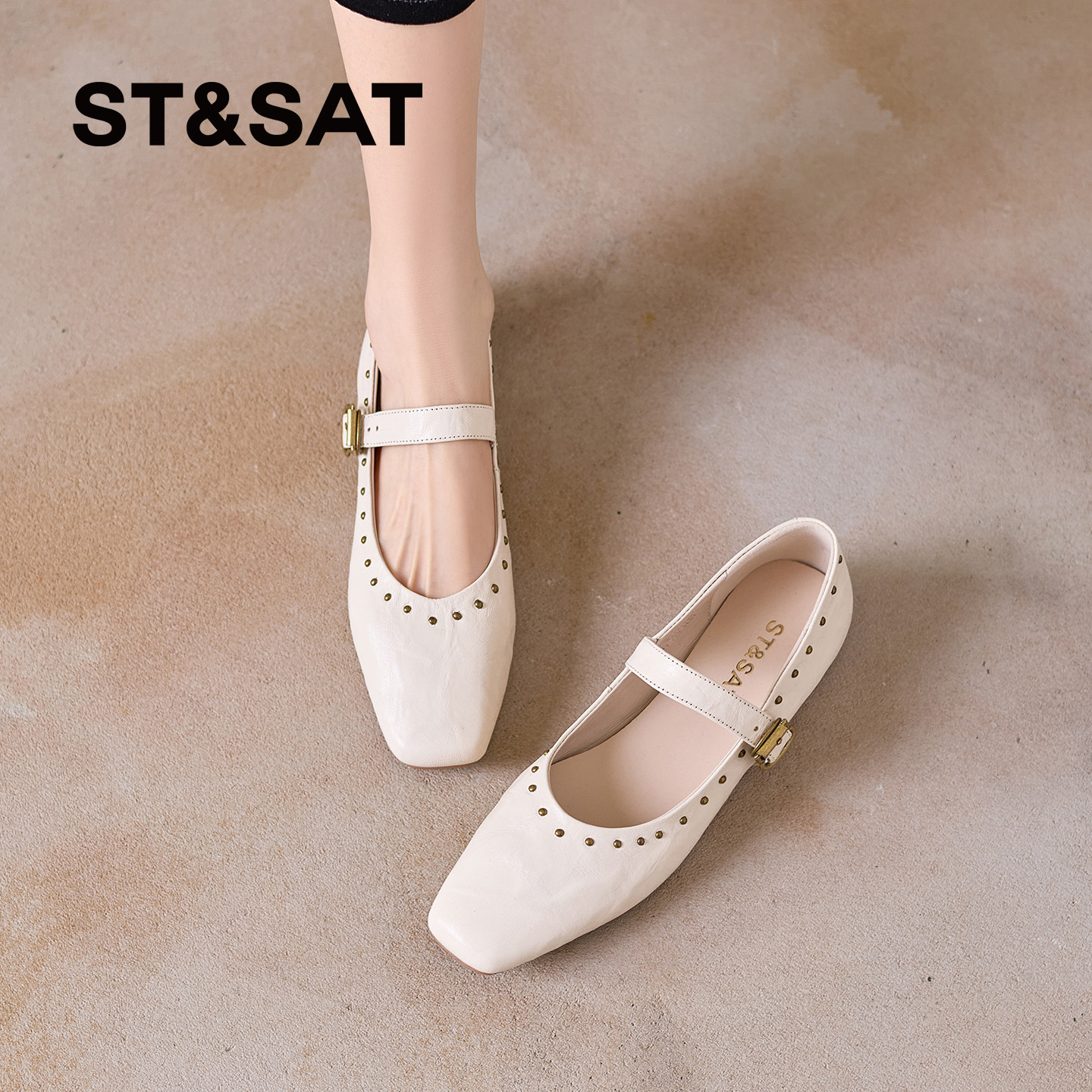 星期六2026新款巨好看法式方头玛丽珍鞋女真皮铆钉一字扣带单鞋春
