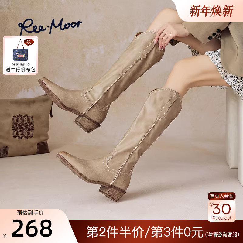 REEMOOR睿慕2025新款V口骑士靴厚底尖头加绒长靴高筒靴女靴子