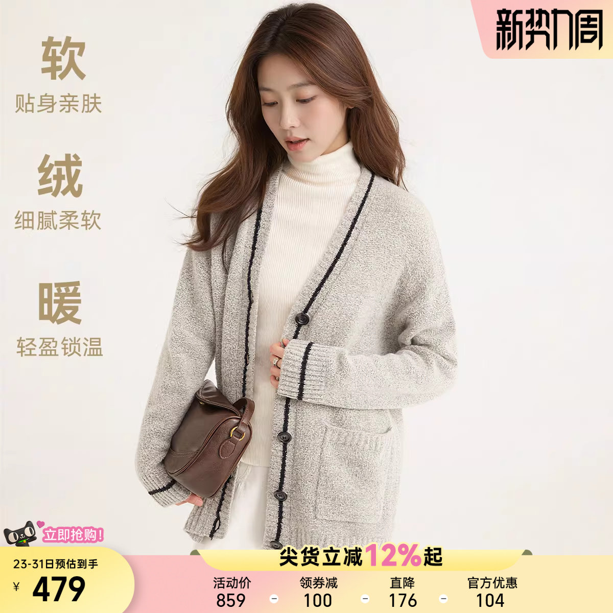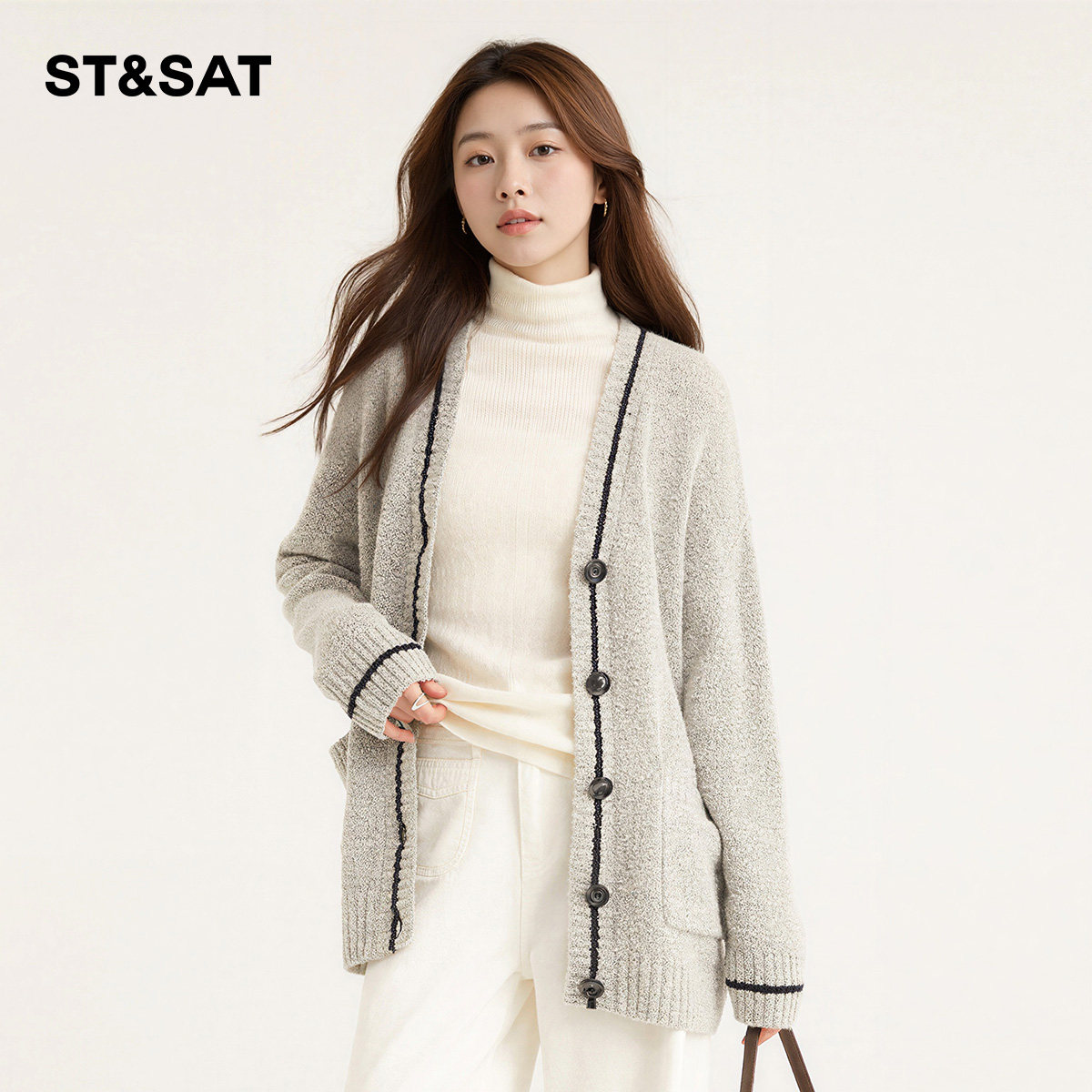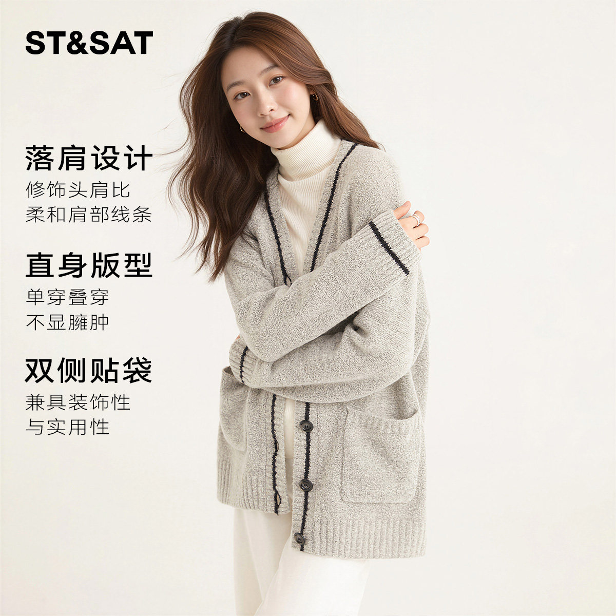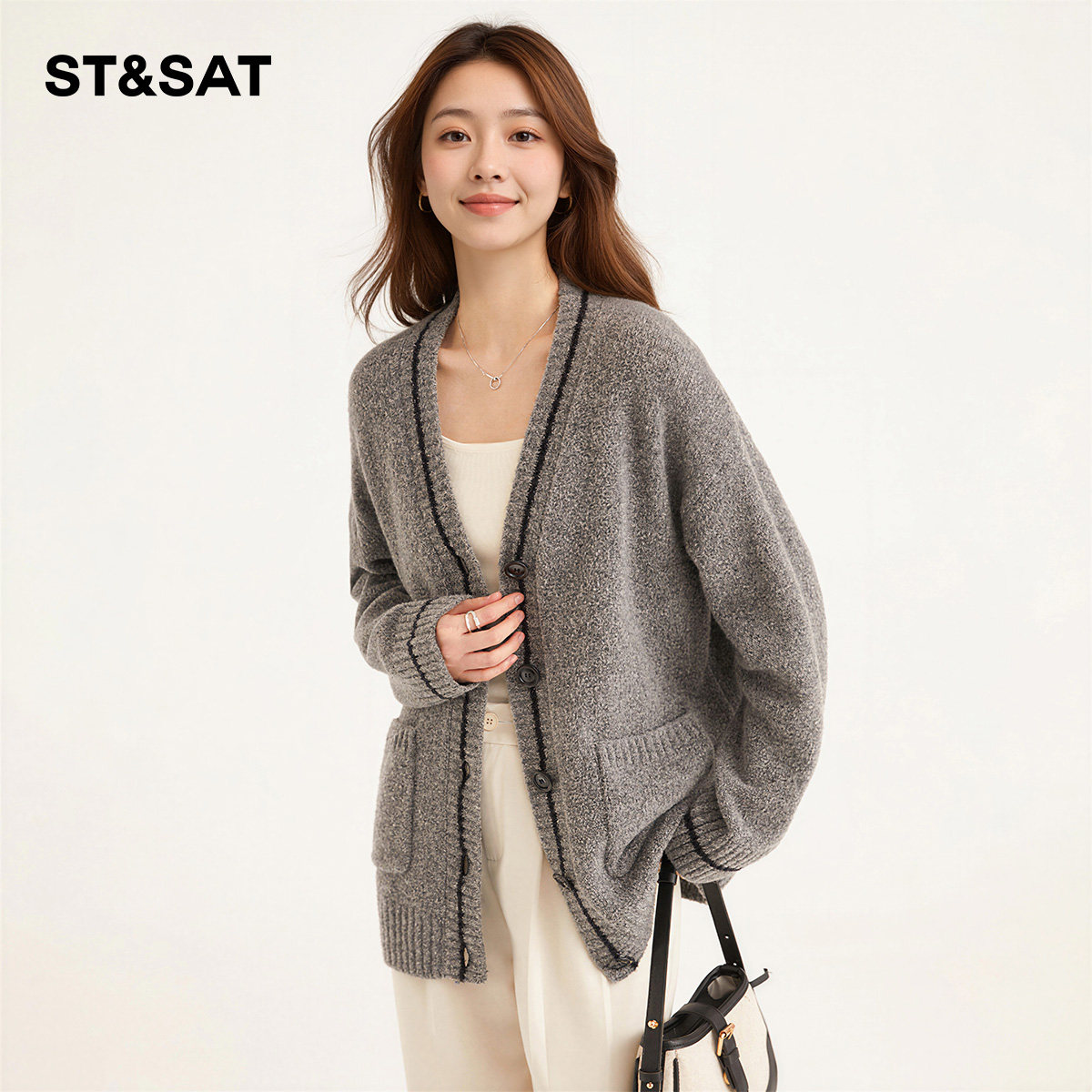 星期六绵羊毛v领针织衫女2026春季新款开衫毛衣慵懒风时尚外套女