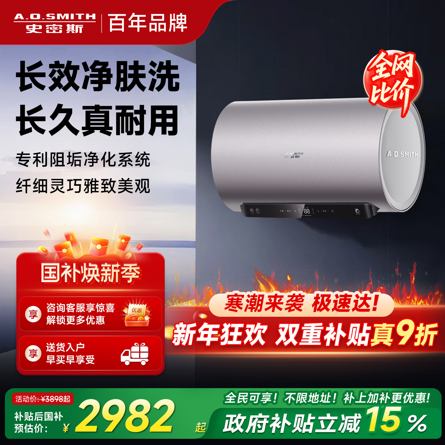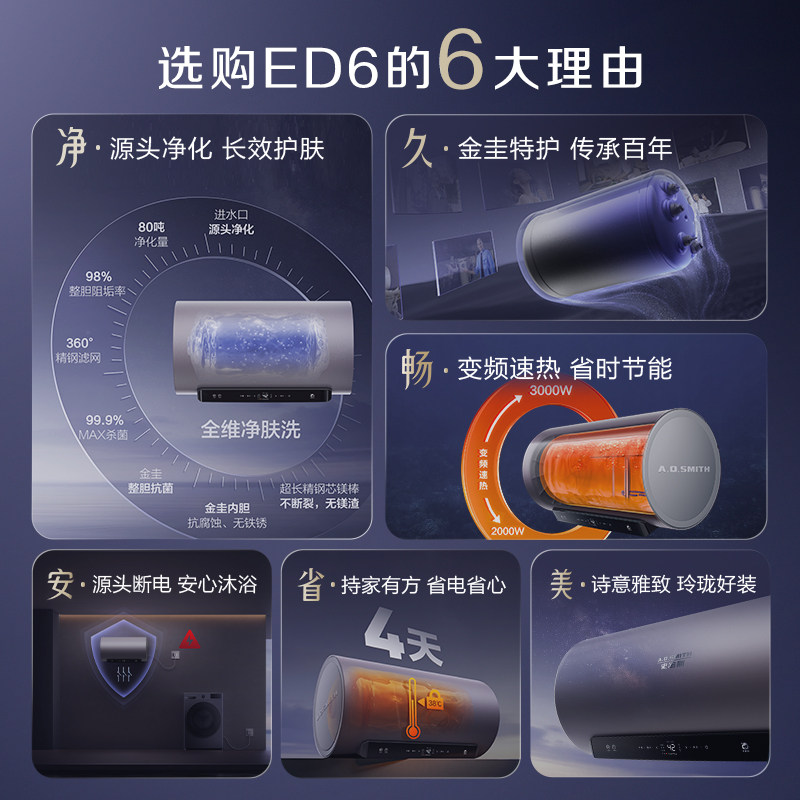 国补AO史密斯电热水器60/80升容量ED6免清洗预约双3kW速热1级能效