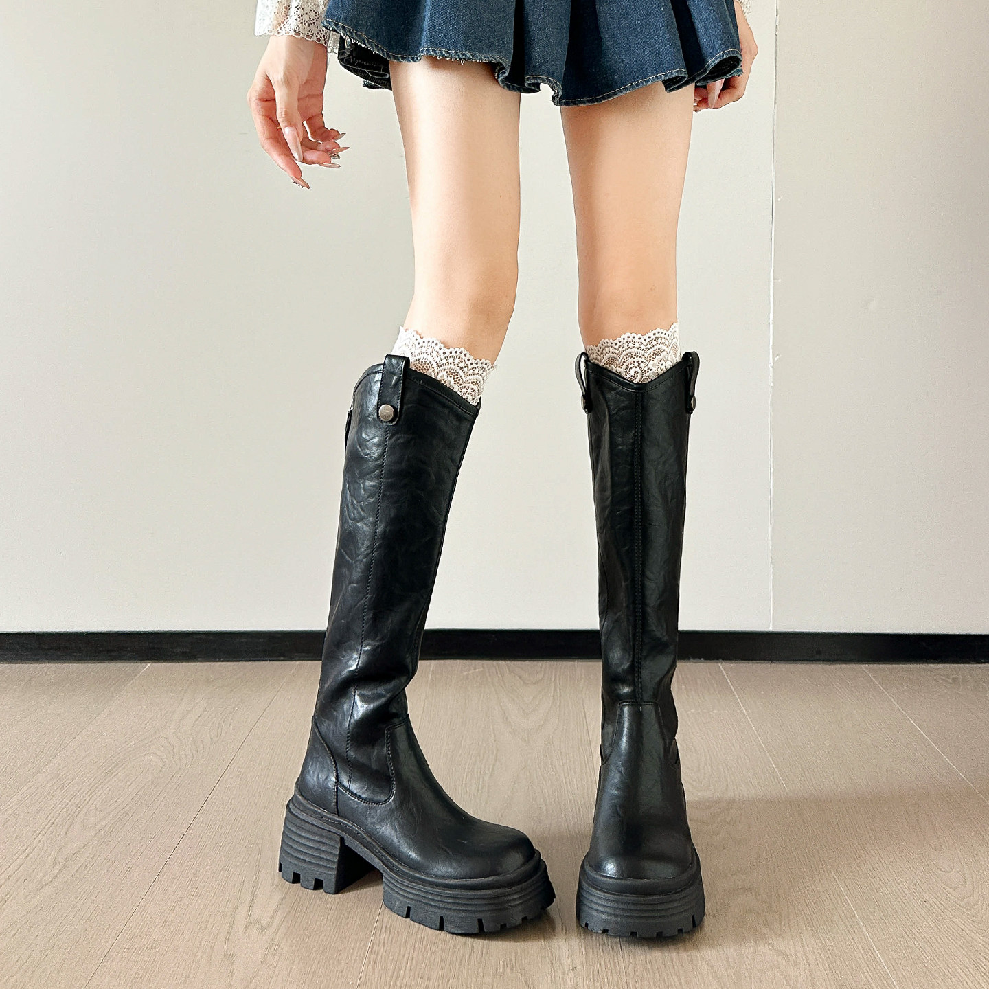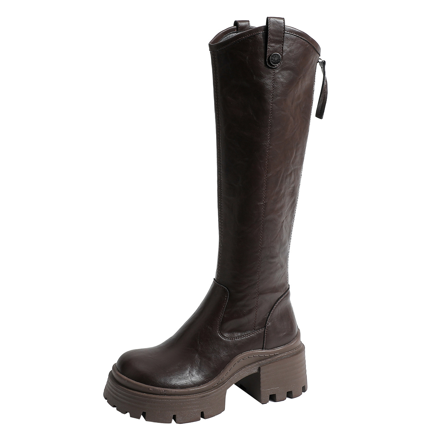 真皮~内增高粗跟骑士靴女秋冬西部靴高筒复古显瘦褶皱堆堆靴长靴