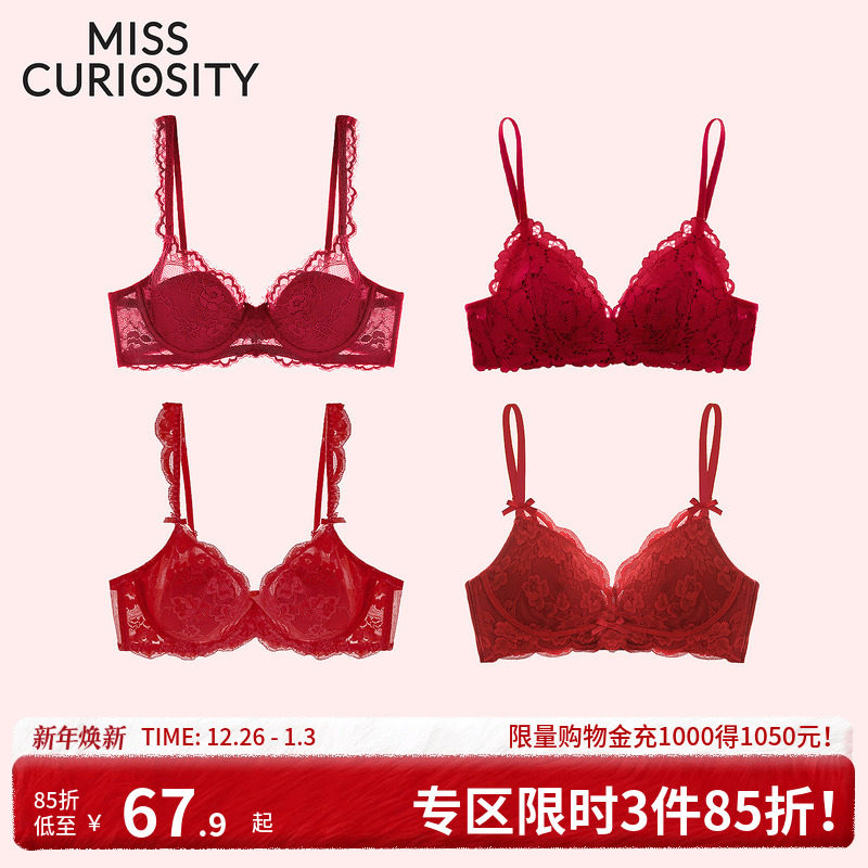 好奇蜜斯红内衣女小胸聚拢无钢圈结婚性感蕾丝文胸罩套装本命年