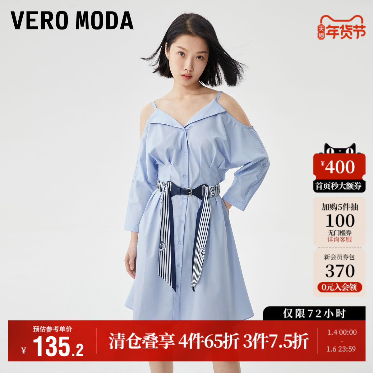 Vero Moda奥莱衬衫式连衣裙子秋季清仓V领露肩收腰七分袖休闲女