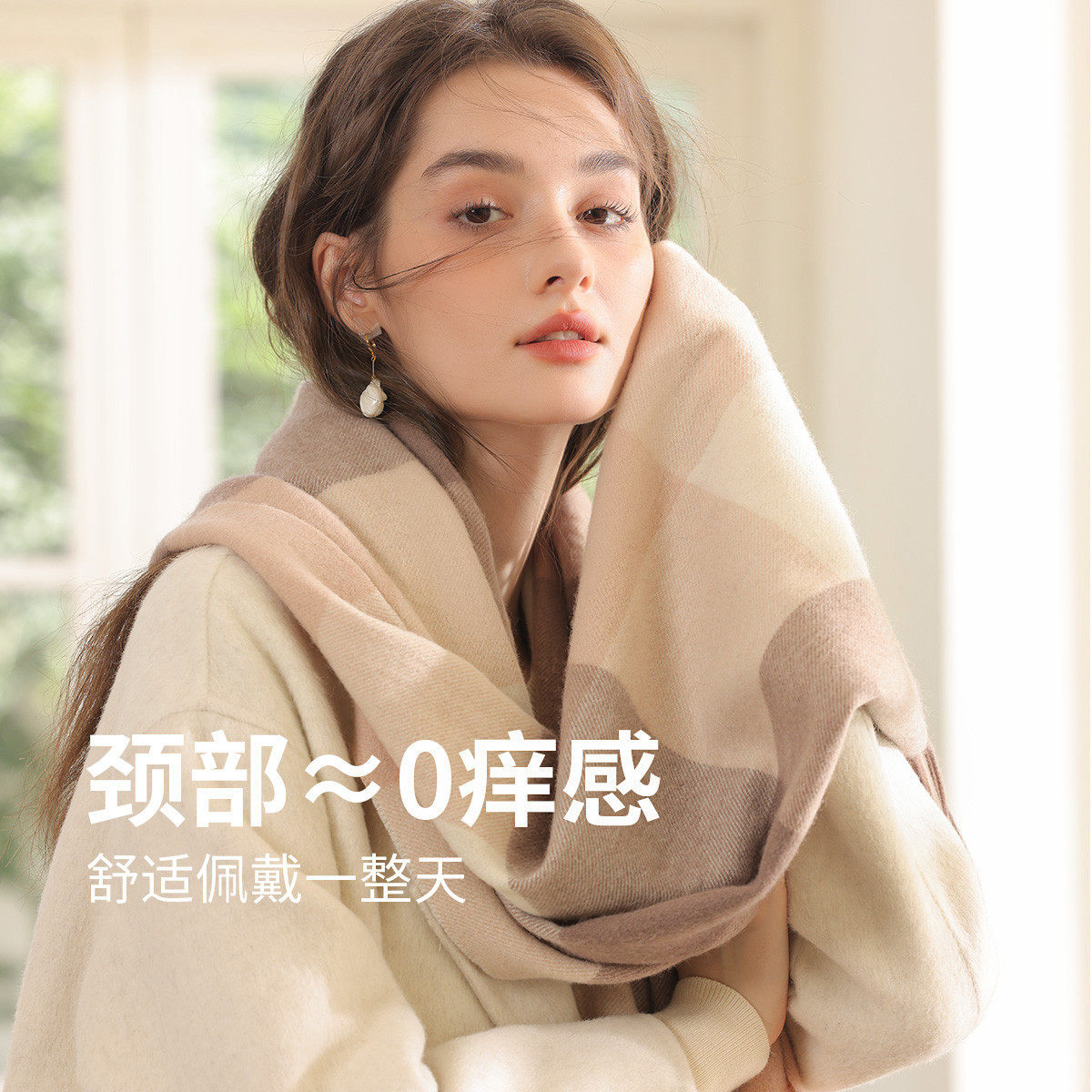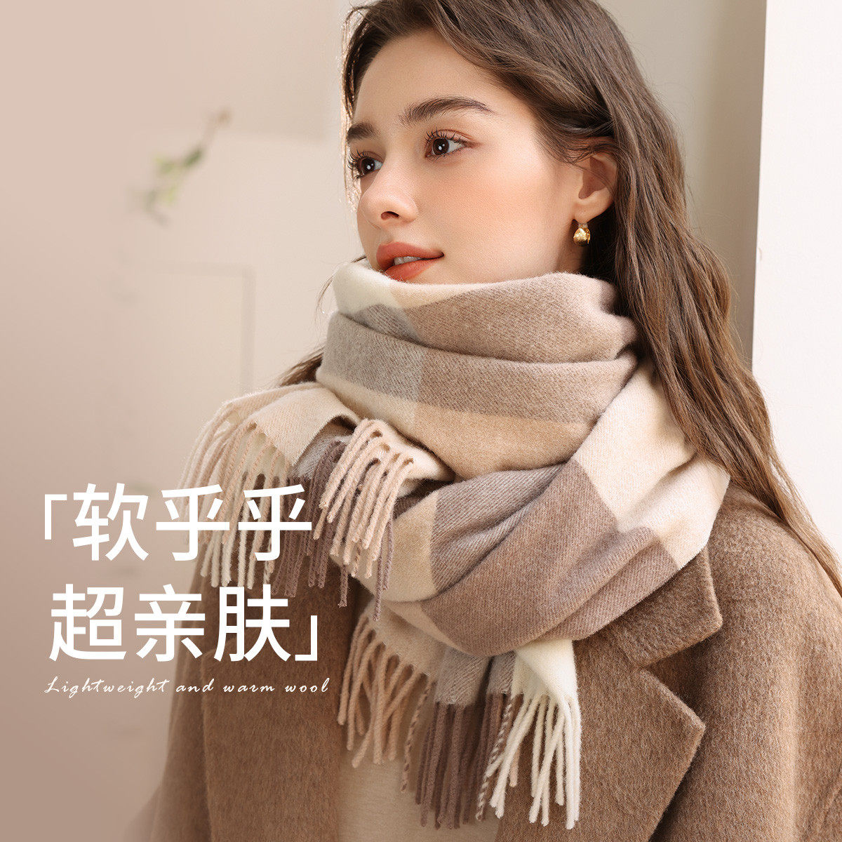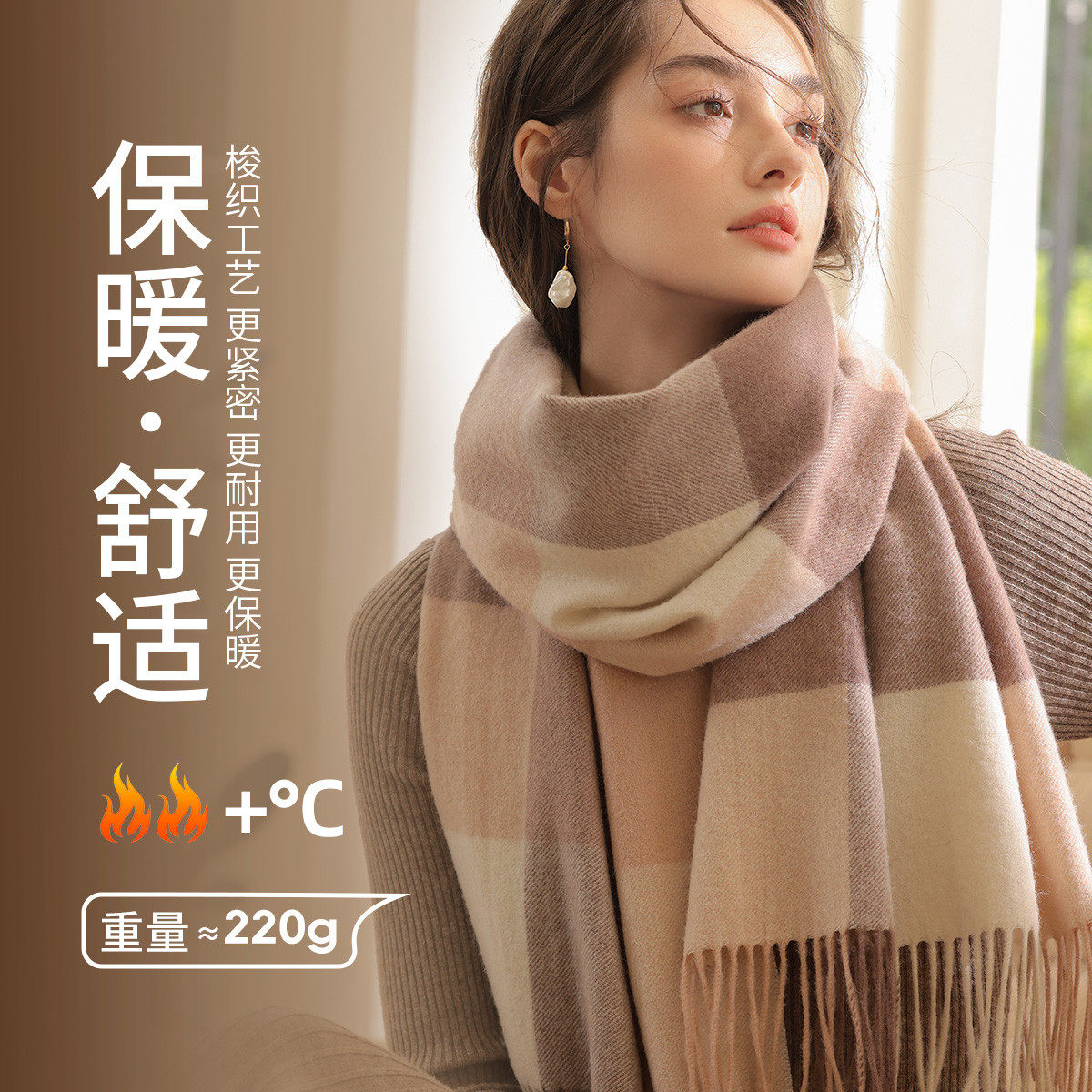 100%纯羊毛围巾女秋冬季高级感格子外搭护肩两用披肩围脖送礼物