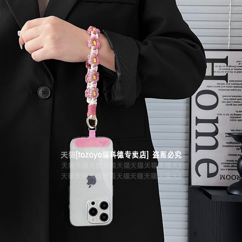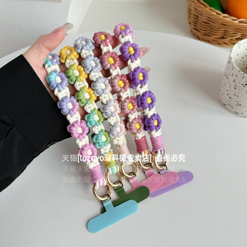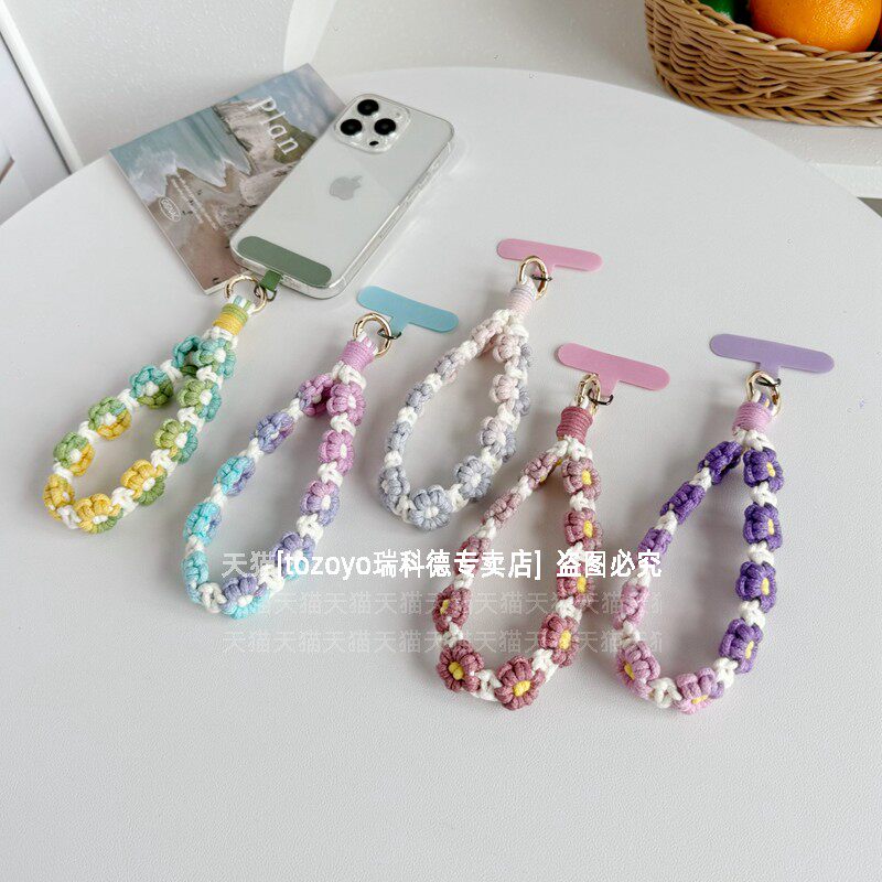 创意渐变色手机挂绳手编小雏菊花花手腕防丢绳高端编织腕带短手绳新款手提挂件带固定片结实防盗钥匙包包带子