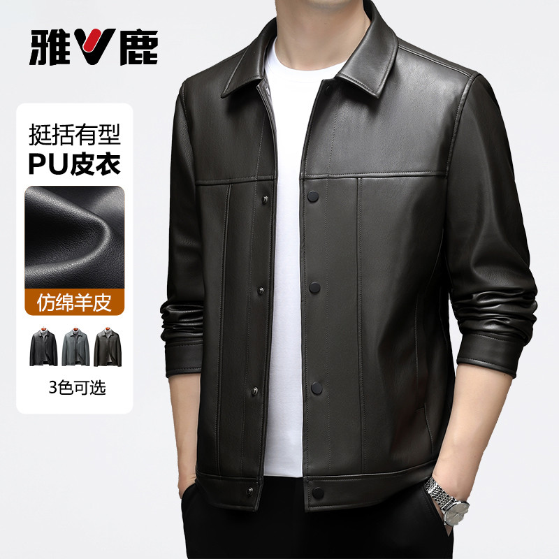 雅鹿皮衣男2025秋季新款翻领短款修身机车仿绵羊皮夹克男士外套
