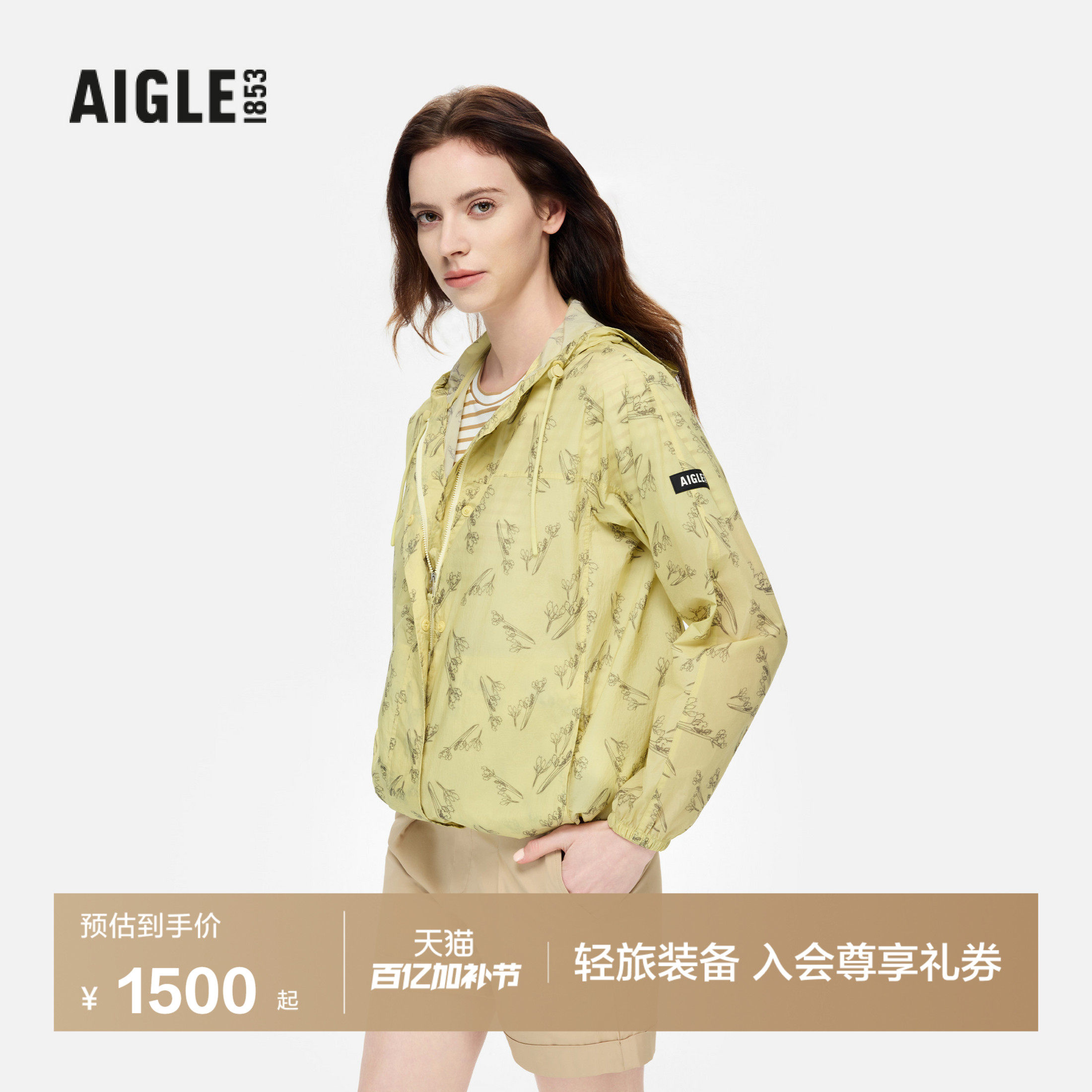 AIGLE艾高WR防泼水UPF40+印花轻量山系防晒衣女士款外套连帽长袖