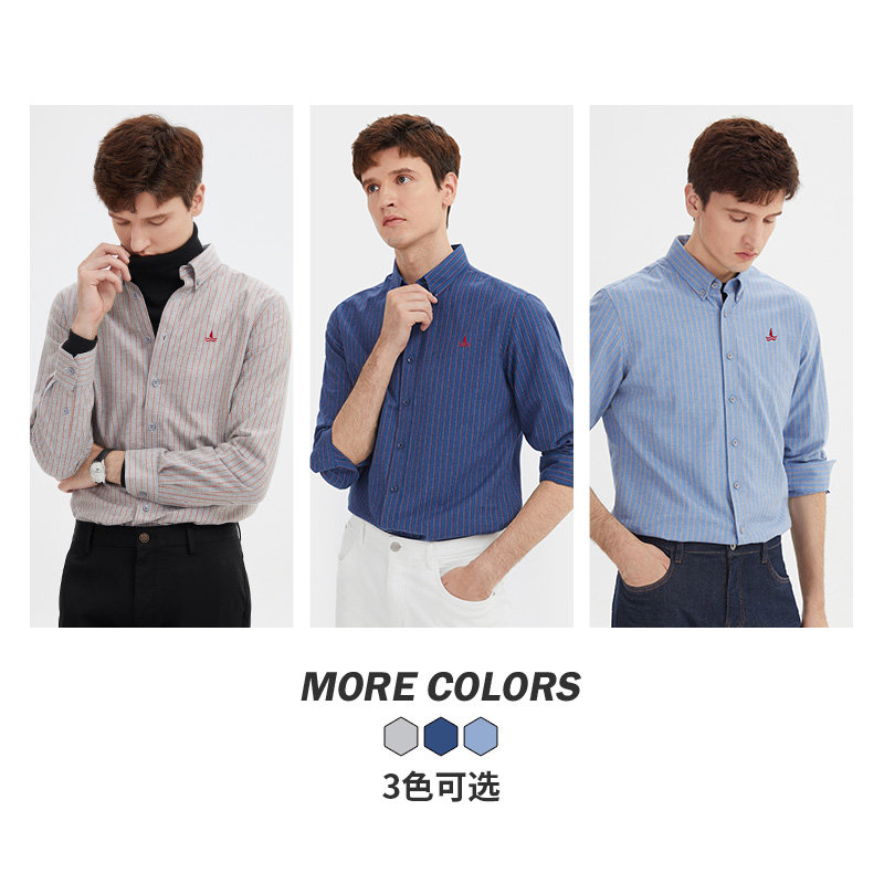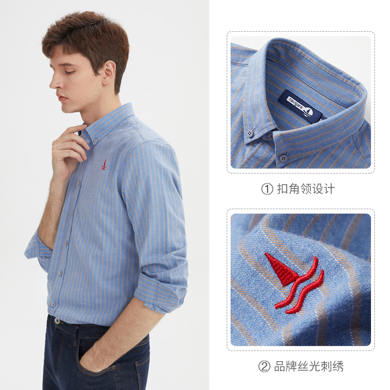 Navigare意大利小帆船秋季新款蓝色条纹衬衫男士磨毛纯棉长袖衬衣