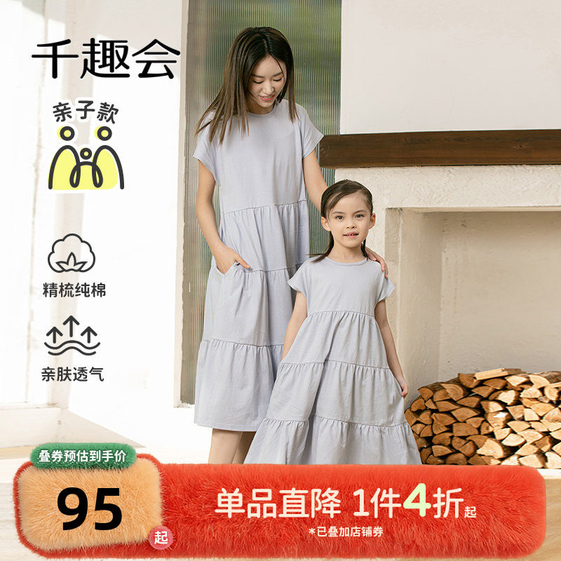 千趣会童装儿童夏季短袖连衣裙亲子装母女装纯色透气棉质女童裙子
