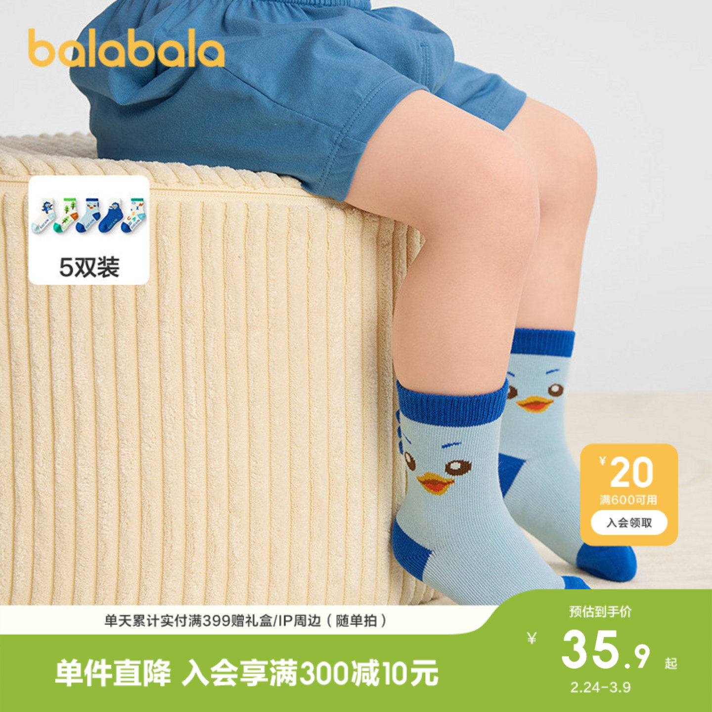 巴拉巴拉儿童袜子宝宝春秋新品婴幼儿中筒袜柔弹无骨手工缝五双装