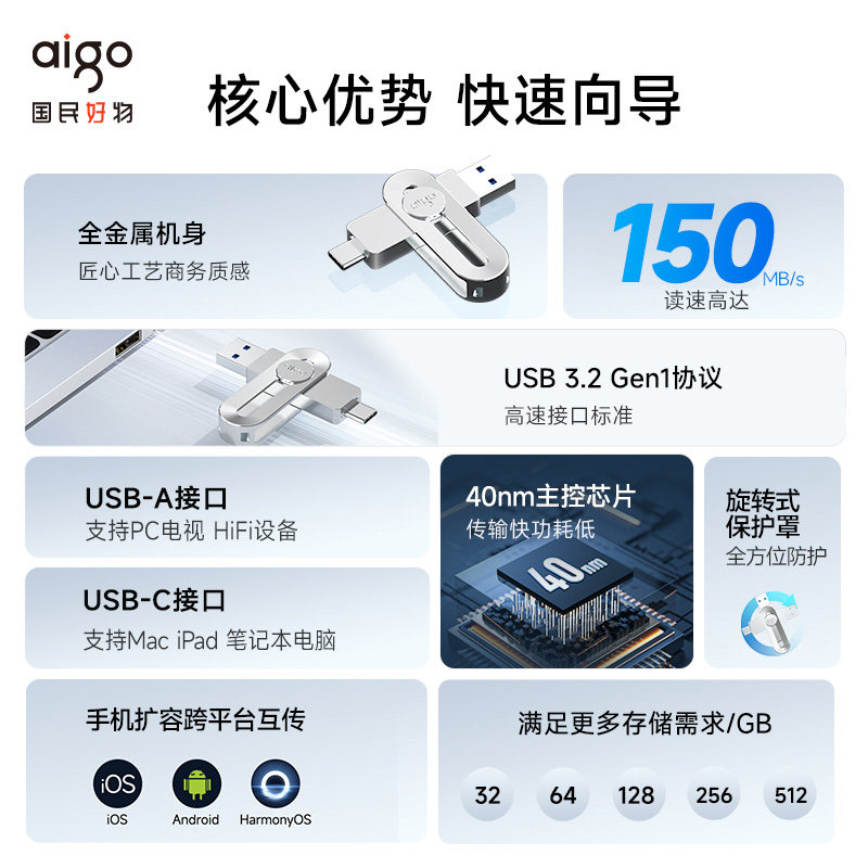 爱国者u盘typec双接口高速usb手机电脑两用优盘大容量定制刻字64g