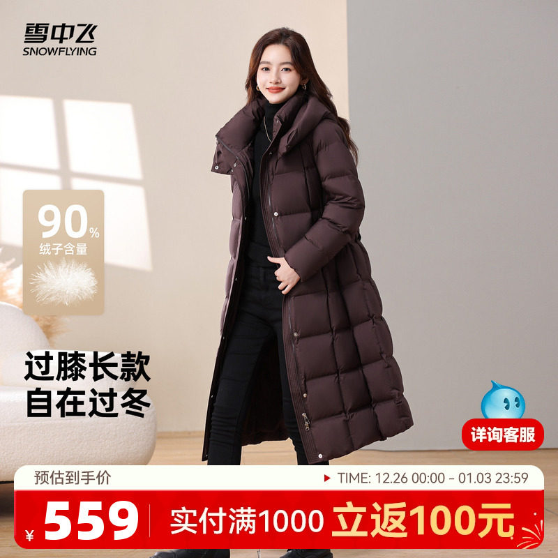 雪中飞2025冬新款女款羽绒服长款气质端庄系带收腰显瘦连帽高级感