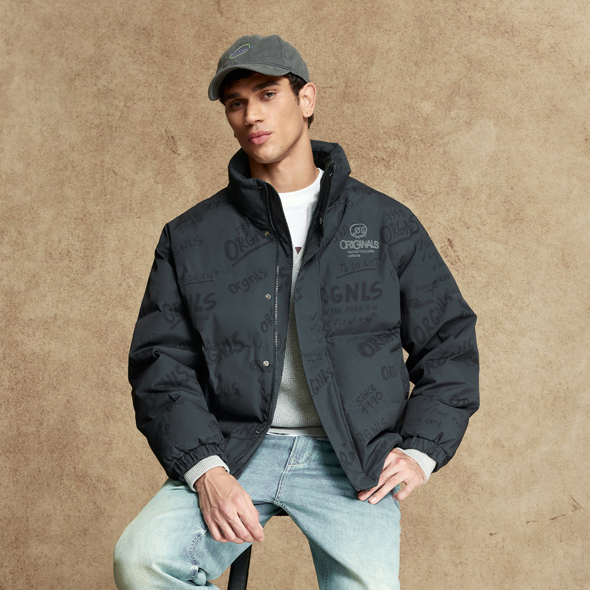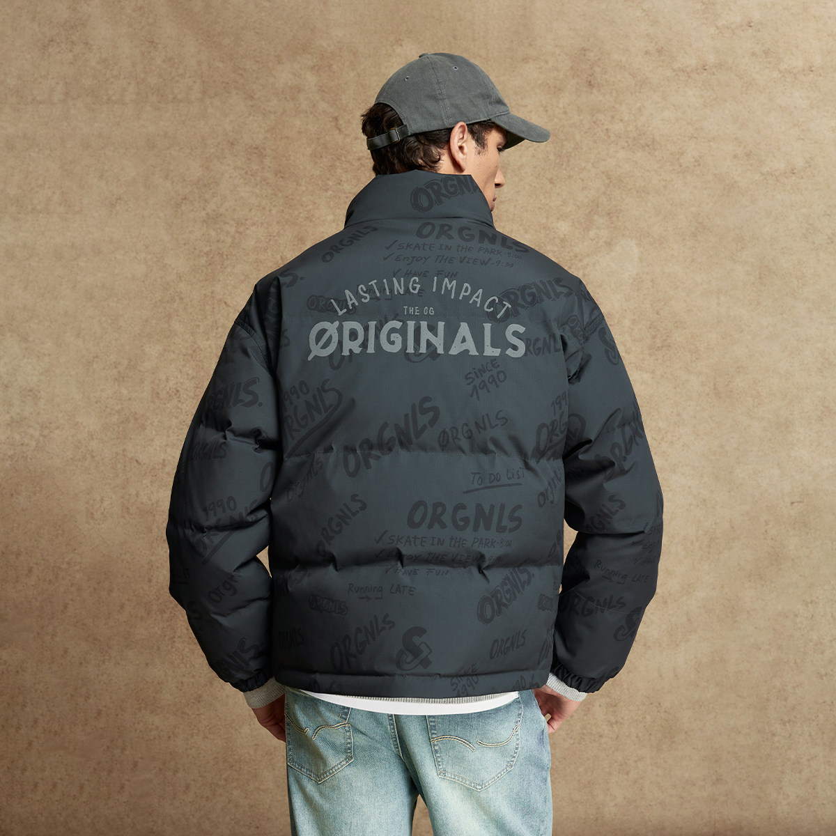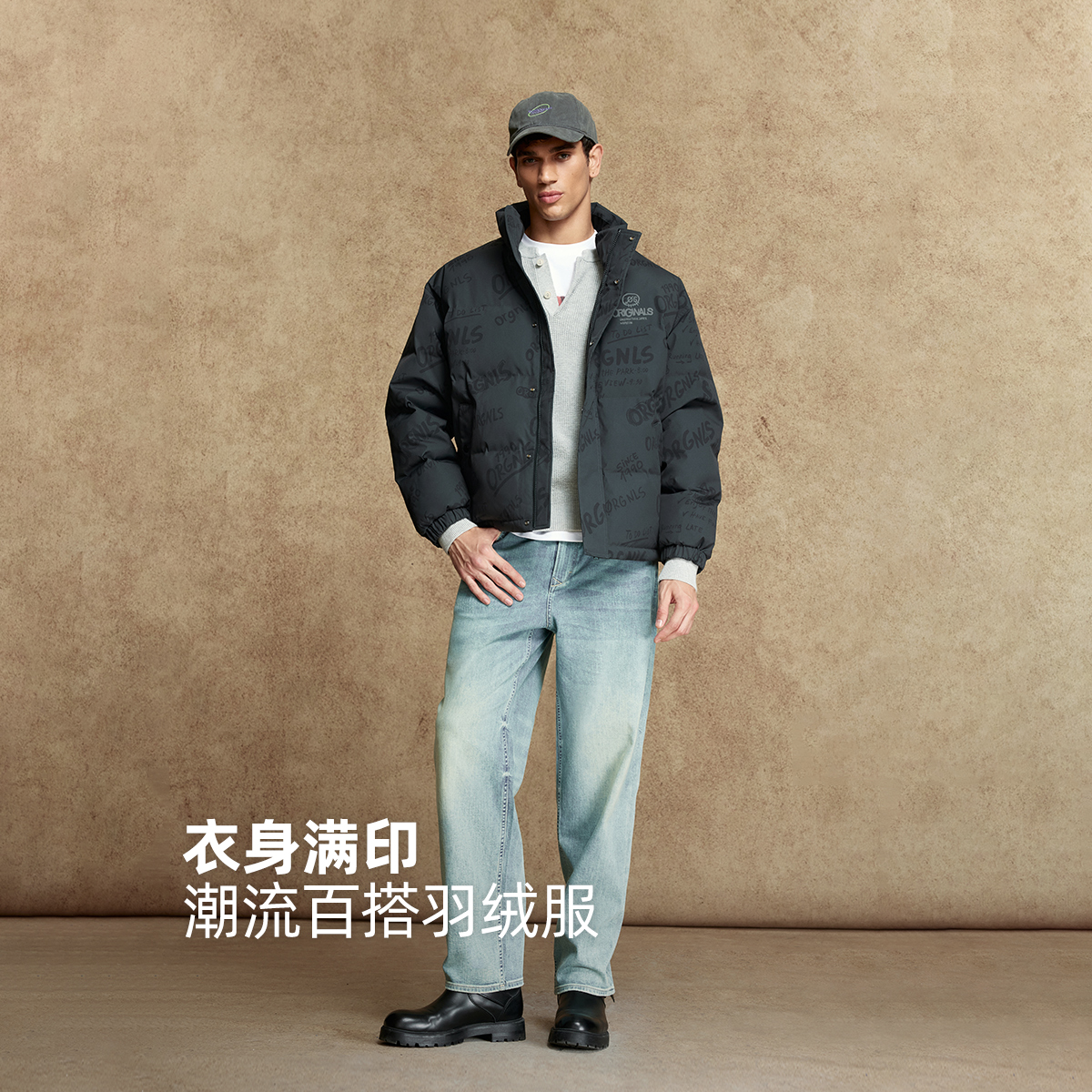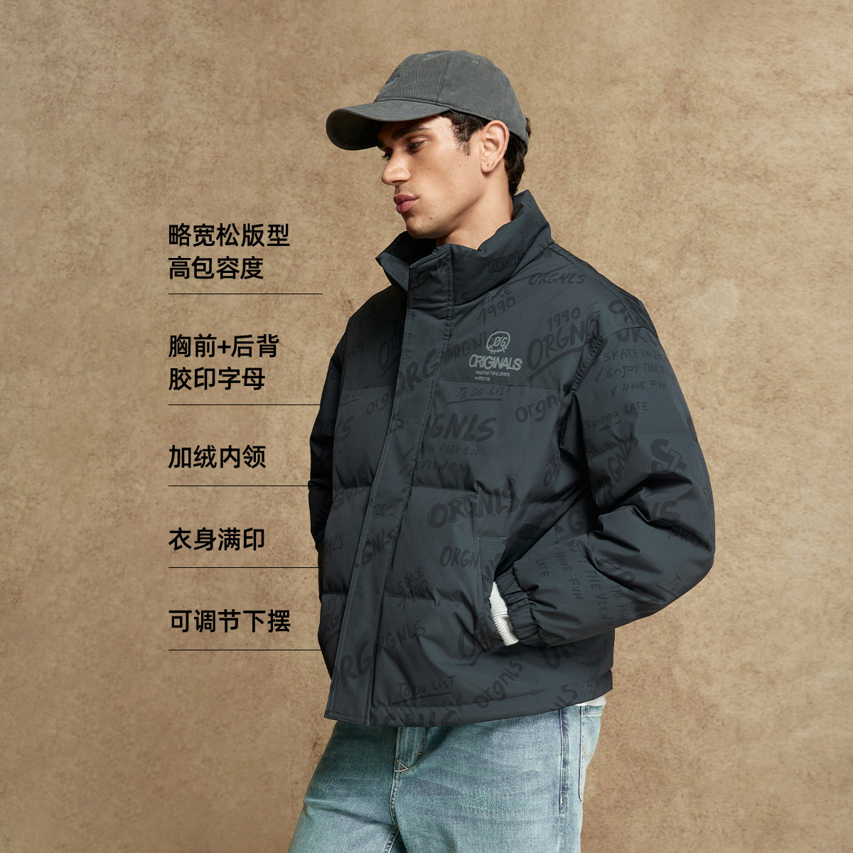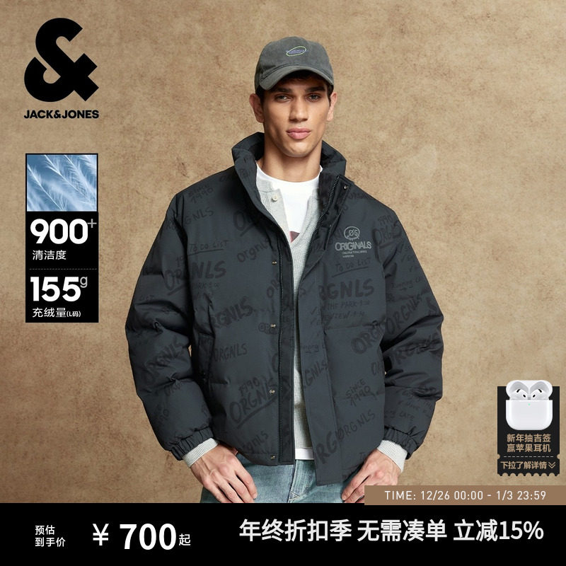 杰克琼斯男装羽绒服冬季新款时尚衣身满印宽松休闲立领保暖外套