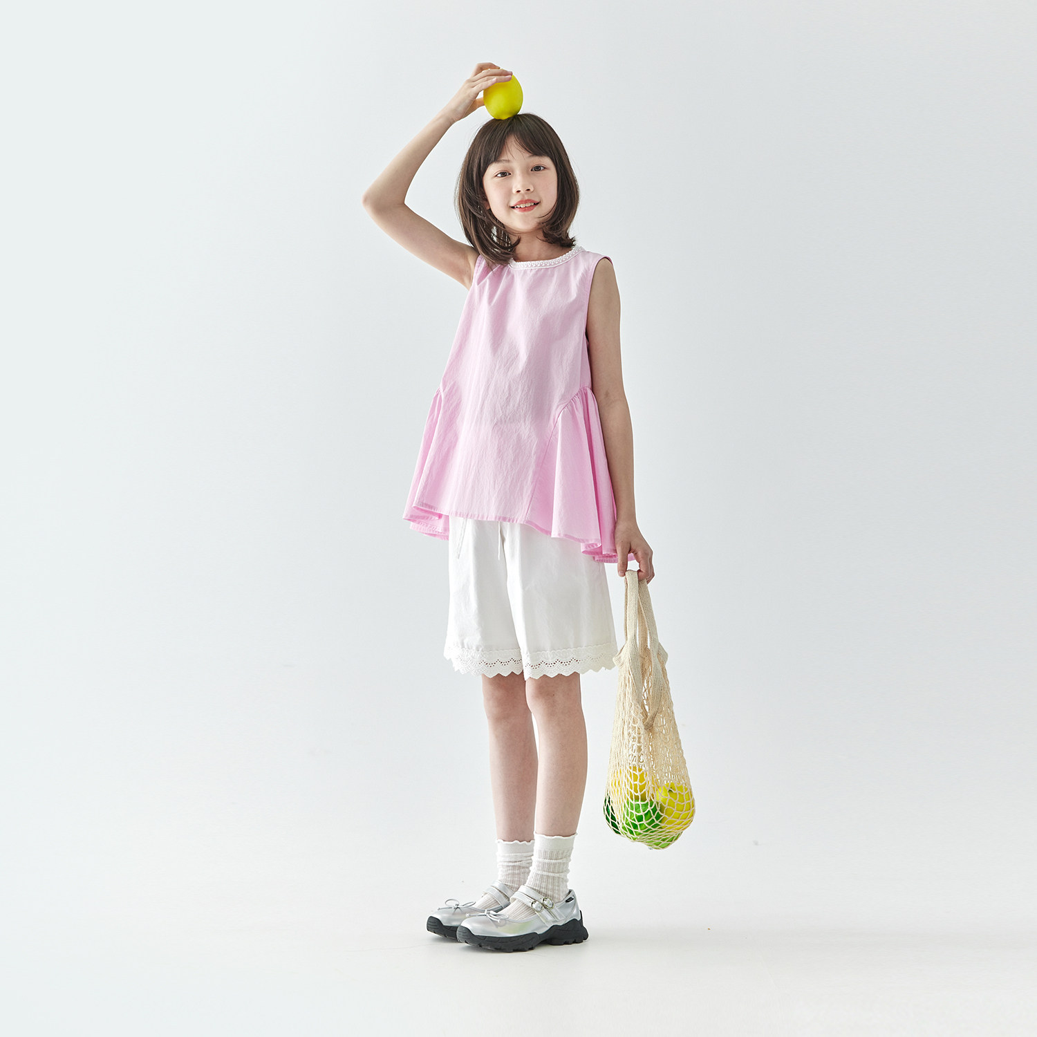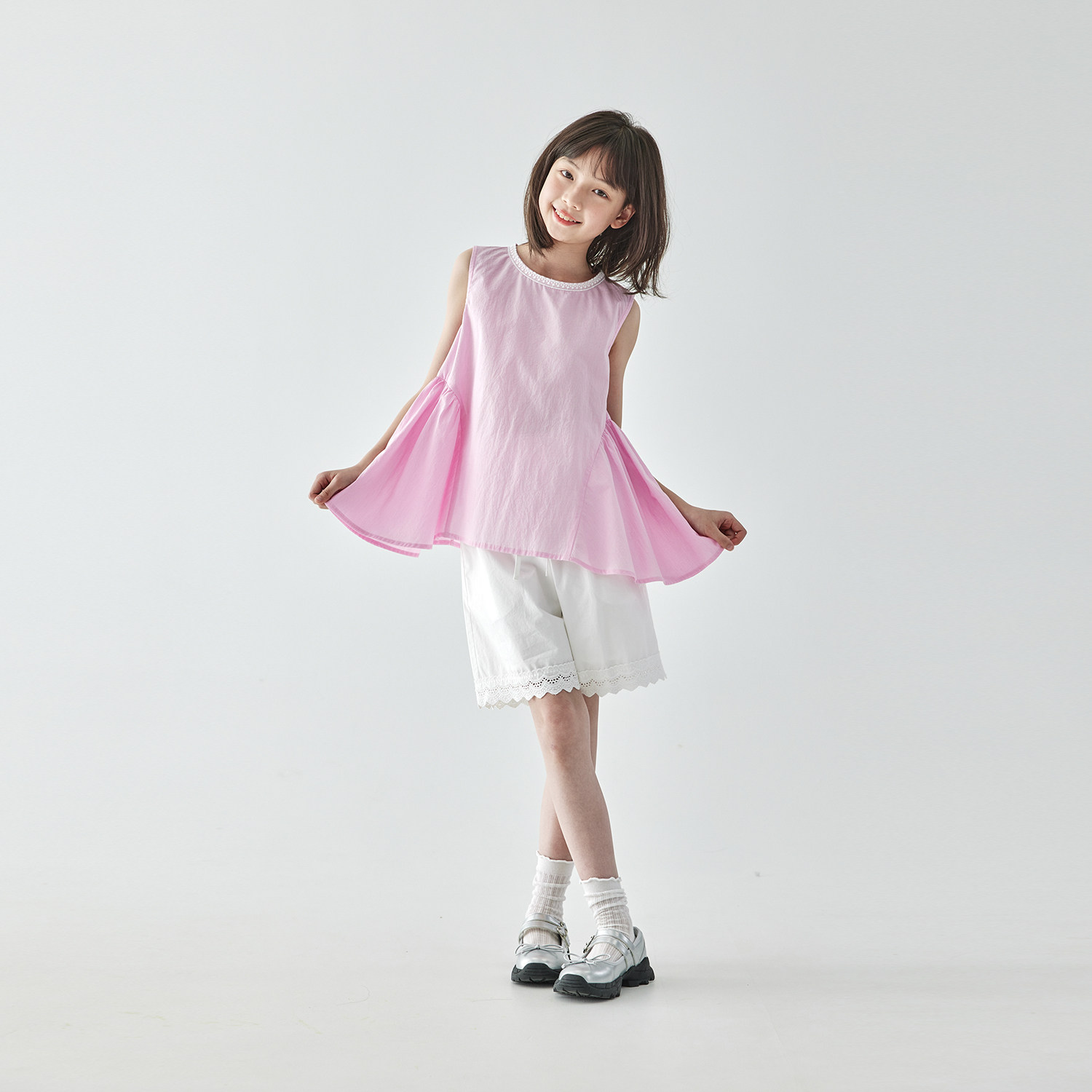 棵初2025夏季新款亲子中大女童粉色条纹棉T恤宽松花边领上衣