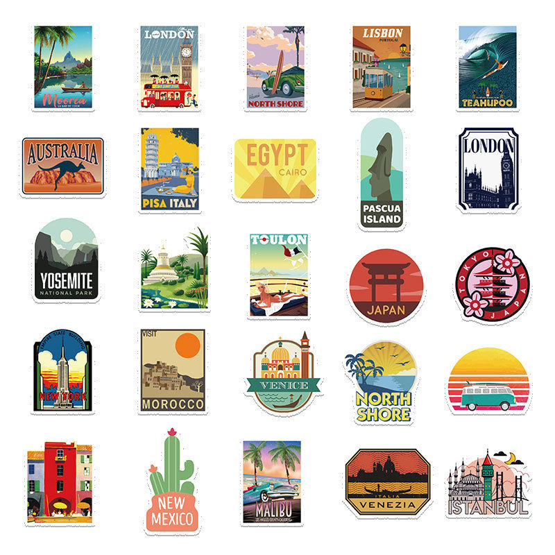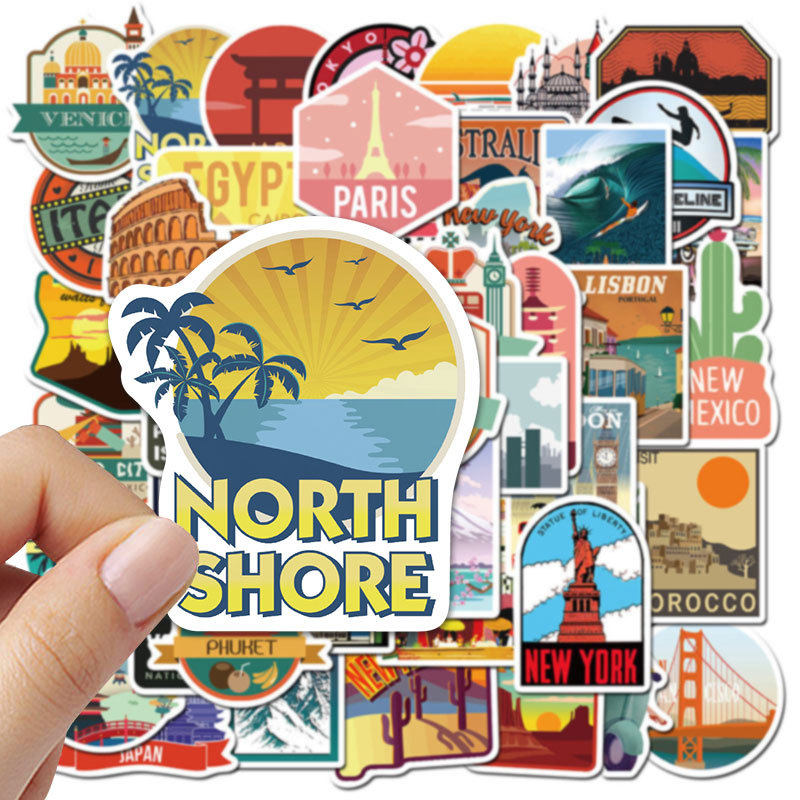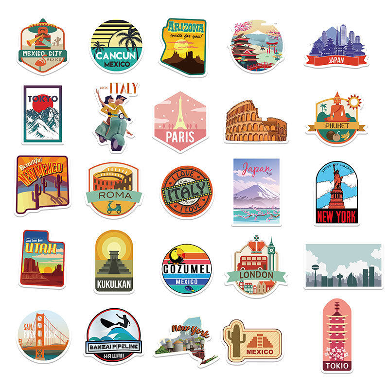 50张旅行城市风景涂鸦贴纸行李拉杆箱滑板车笔记本电脑防水贴画