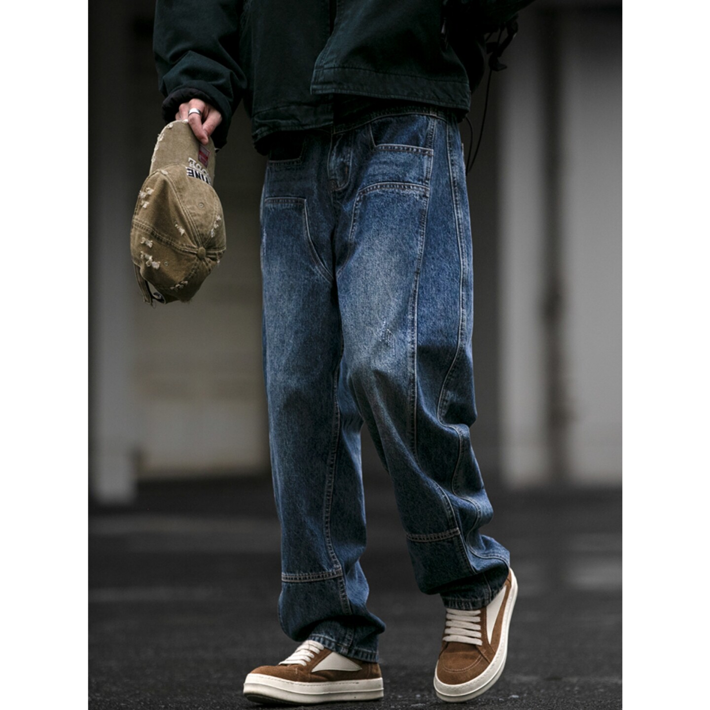 日系复古立体多折位伐木工装牛仔裤男潮牌宽松直筒微锥弯刀长裤子