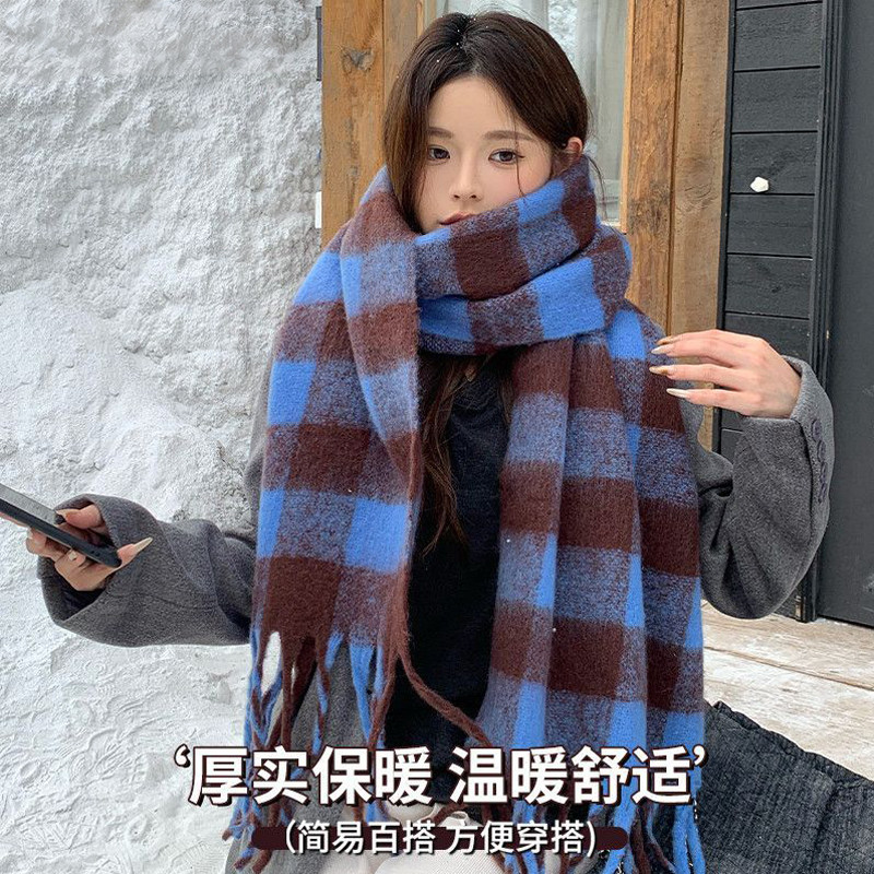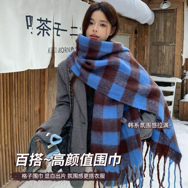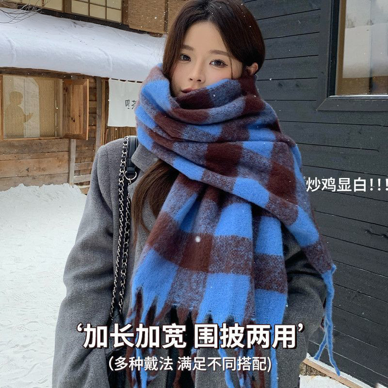 蓝色格子围巾女冬季保暖坎肩高颜值韩系氛围感加大加厚护颈围脖