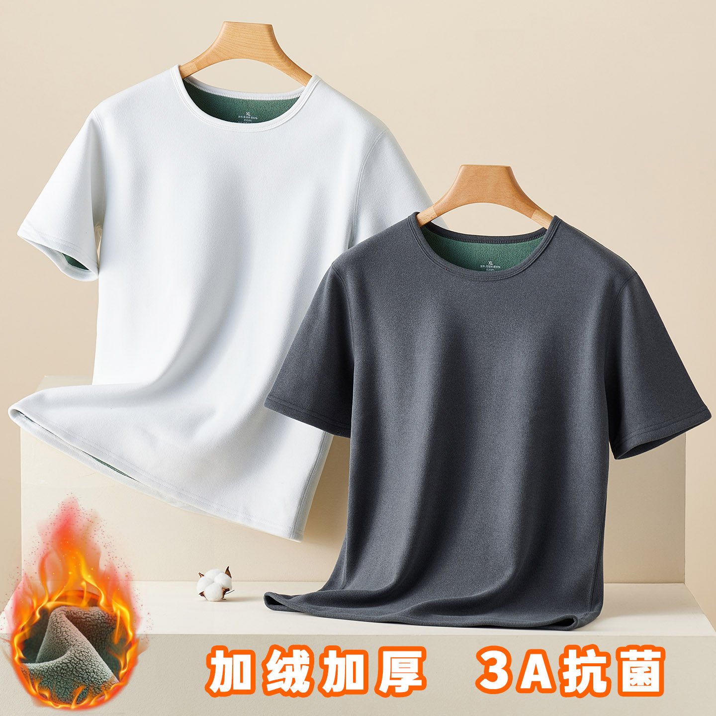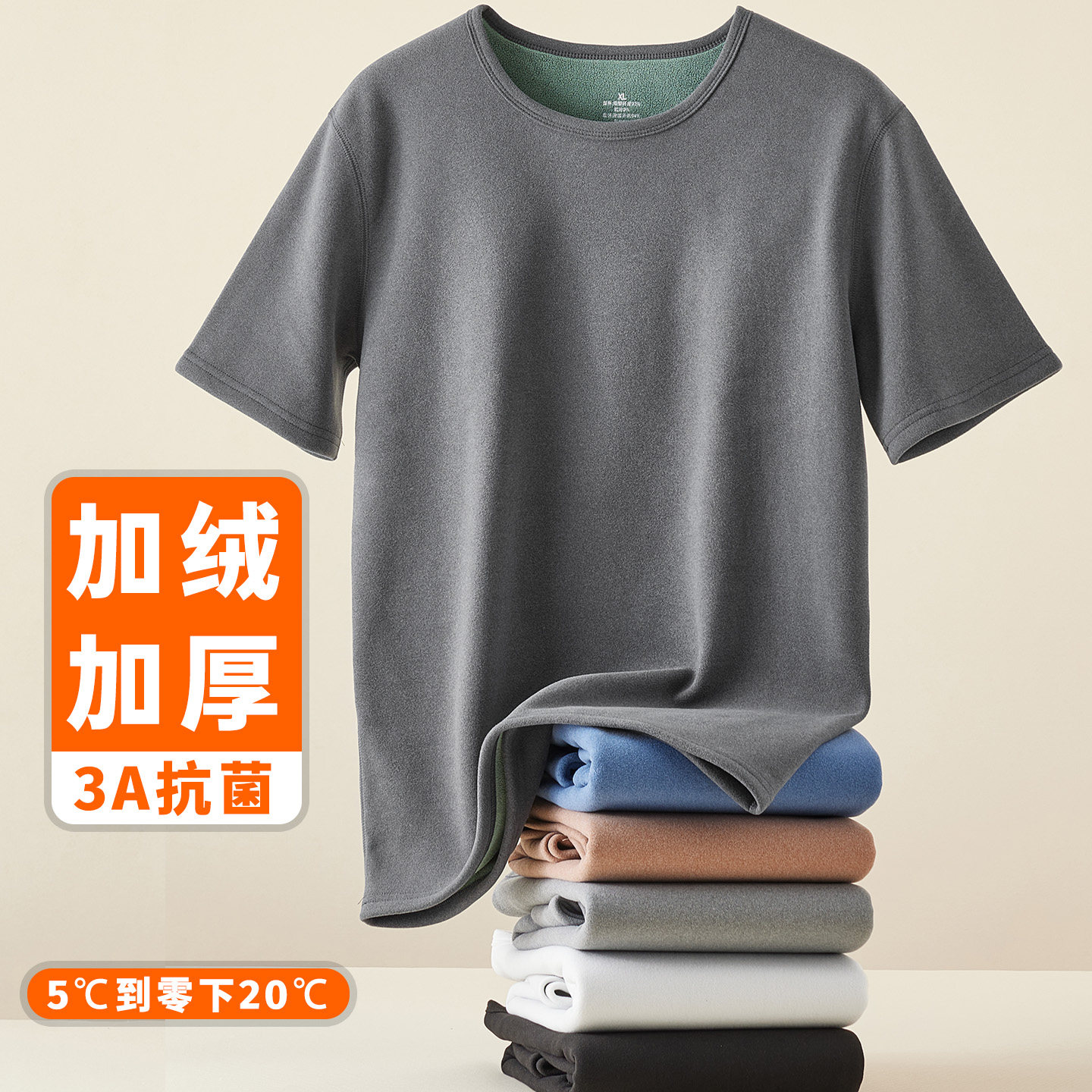 加绒加厚修身圆领短袖男T恤冬季保暖内搭半袖打底衫体恤上衣零下