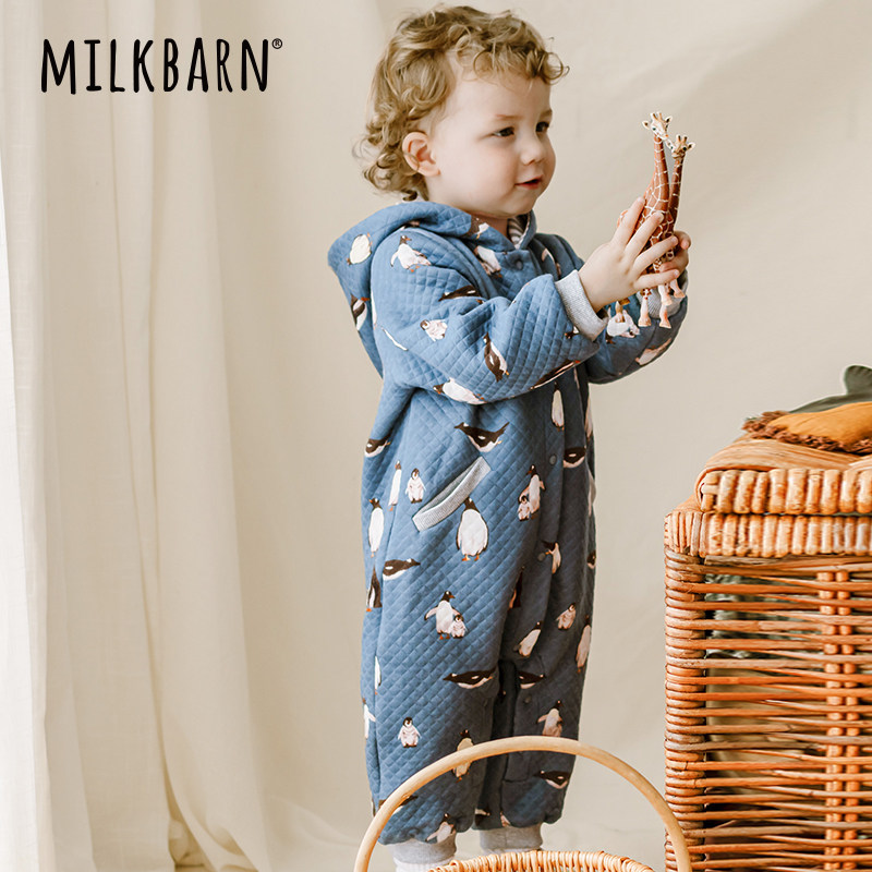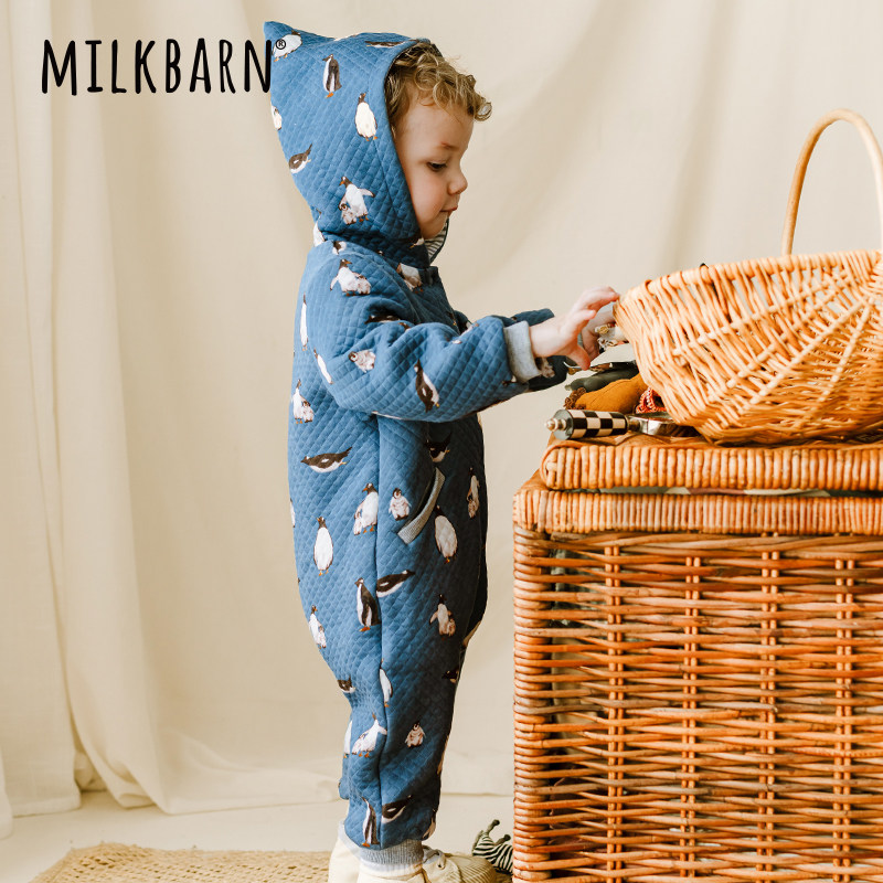 Milkbarn秋冬新品婴儿连帽连体衣服宝宝加厚哈衣婴幼儿爬爬服