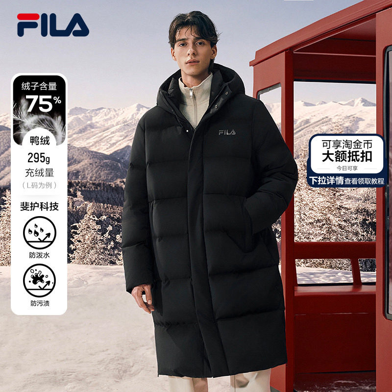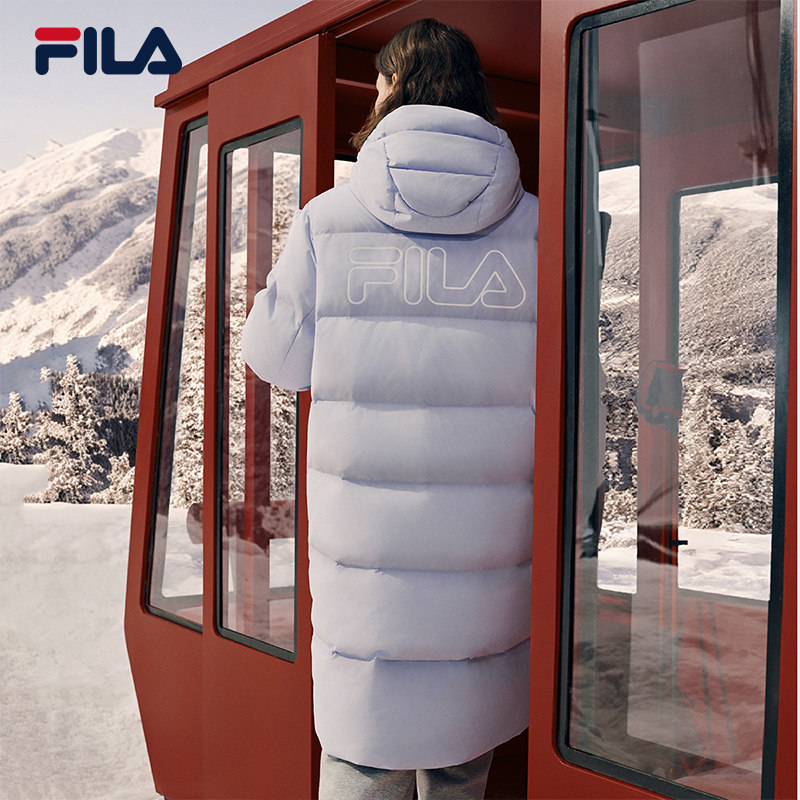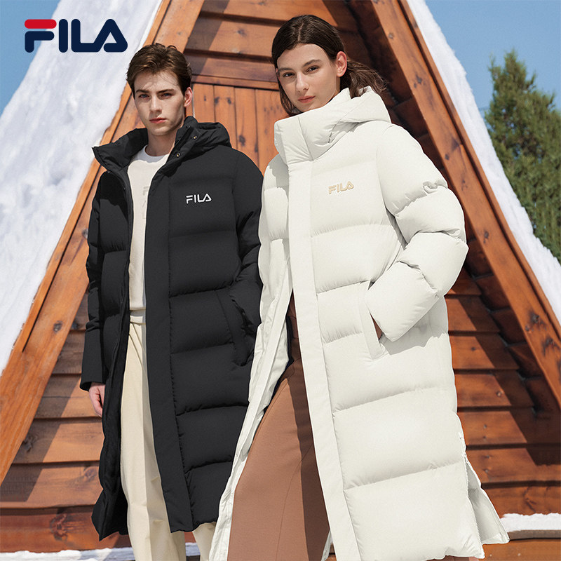 FILA斐乐情侣长款羽绒服女2025冬新款鸭绒保暖连帽双头拉链外套男