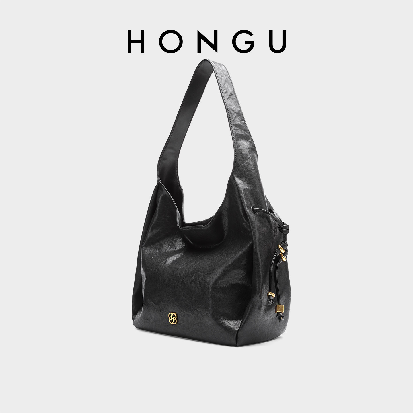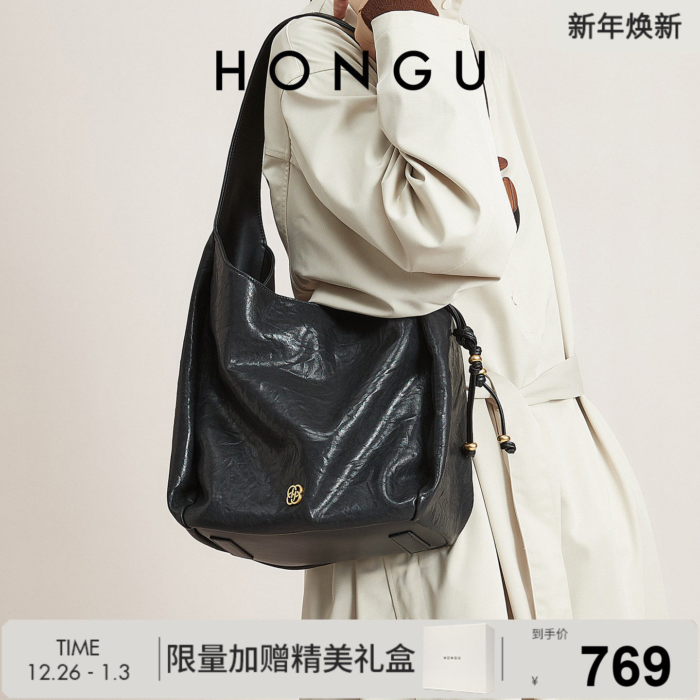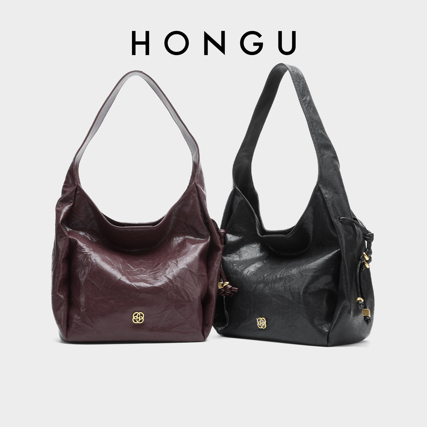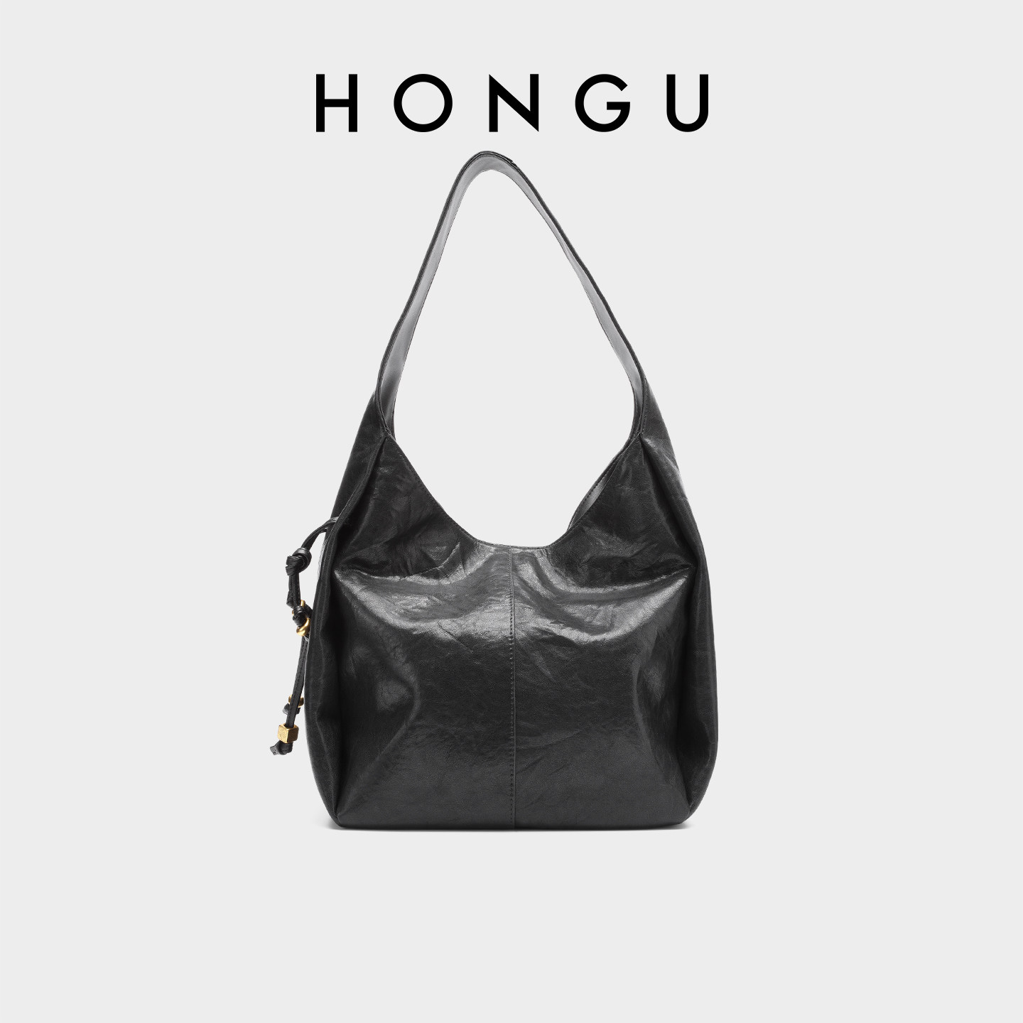 红谷包包2025新款手抓纹植鞣牛皮单肩腋下包通勤高级感hobo包女包