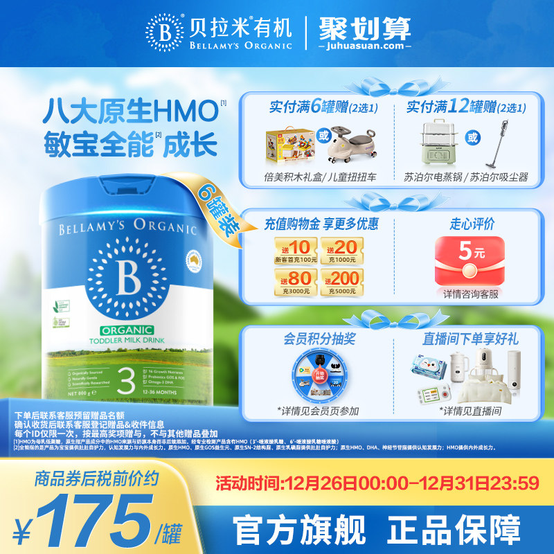 【官方正品】贝拉米经典HMO有机幼儿配方DHA牛奶粉3段800g*6罐装