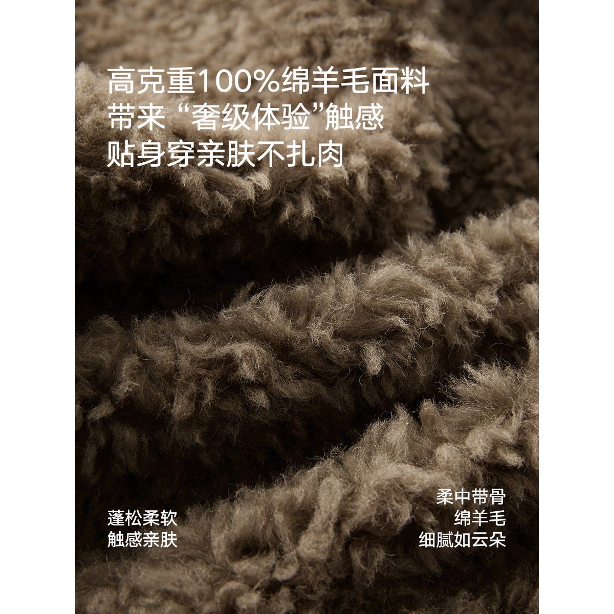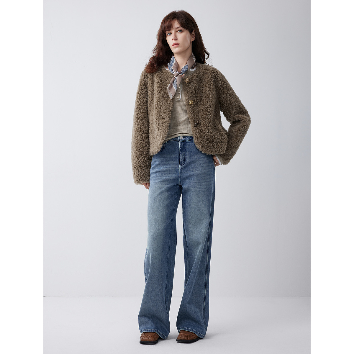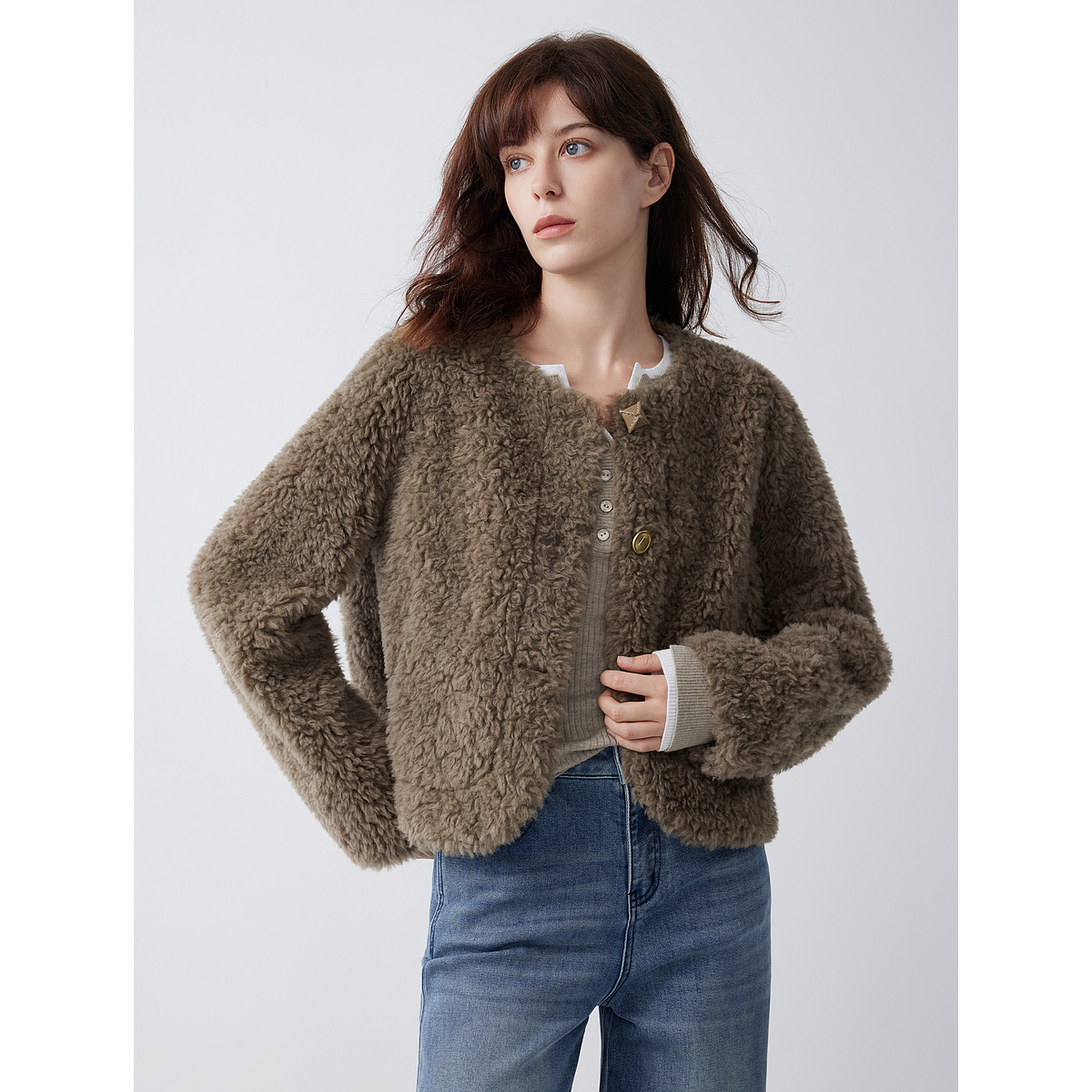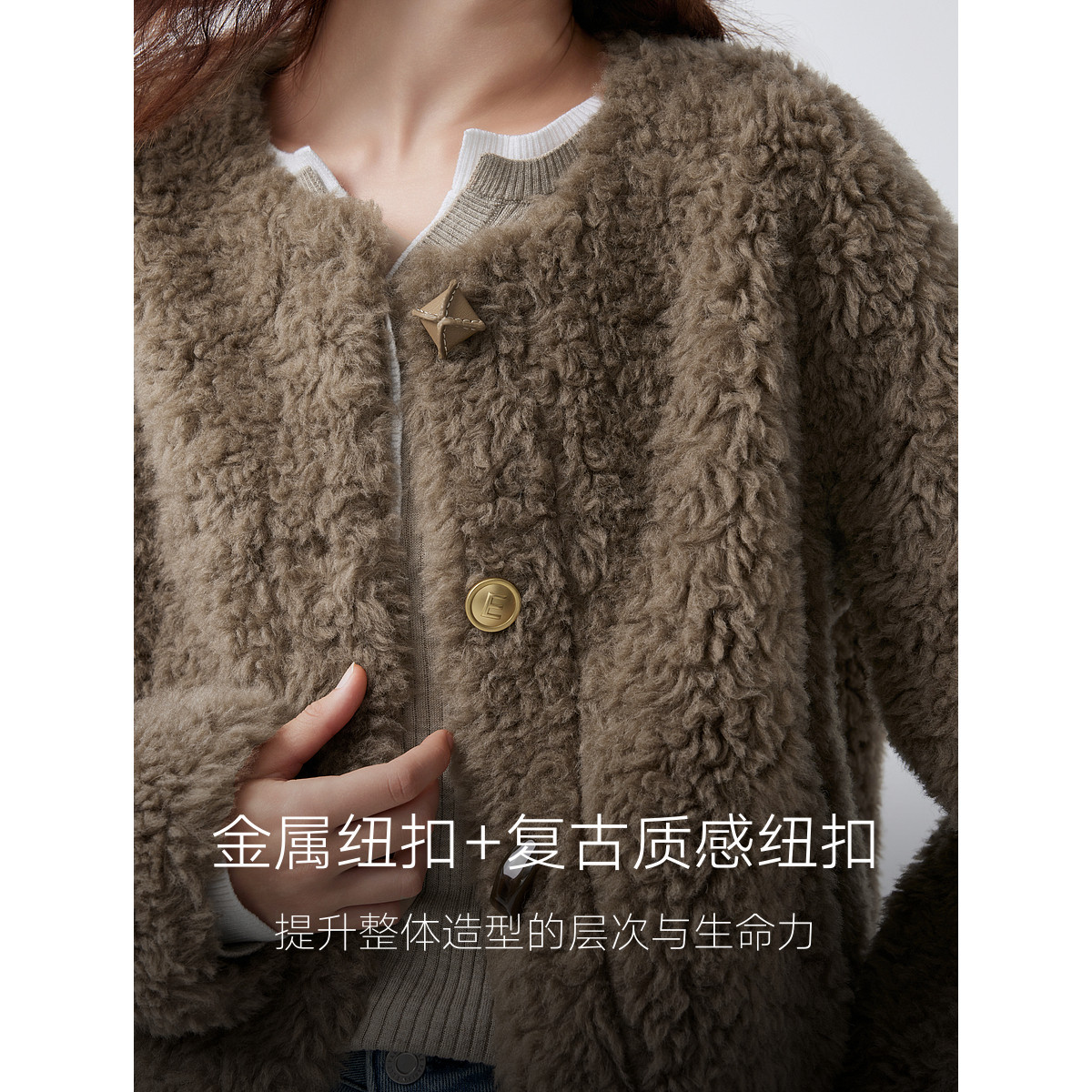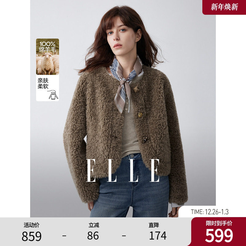 【100%绵羊毛】ELLE咖色复古毛绒短外套2025冬小香风羊羔毛上衣