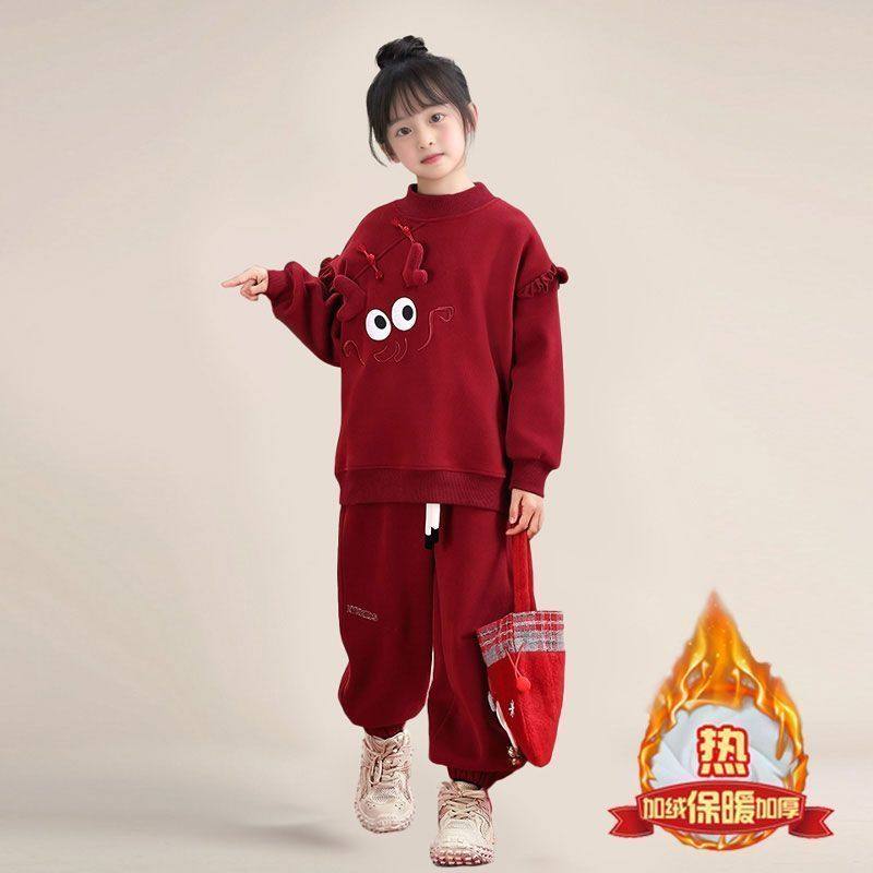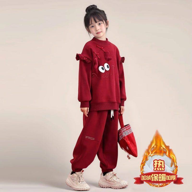 女童红色喜庆套装冬季儿童洋气卡通卫衣女孩运动上衣束脚裤两件套