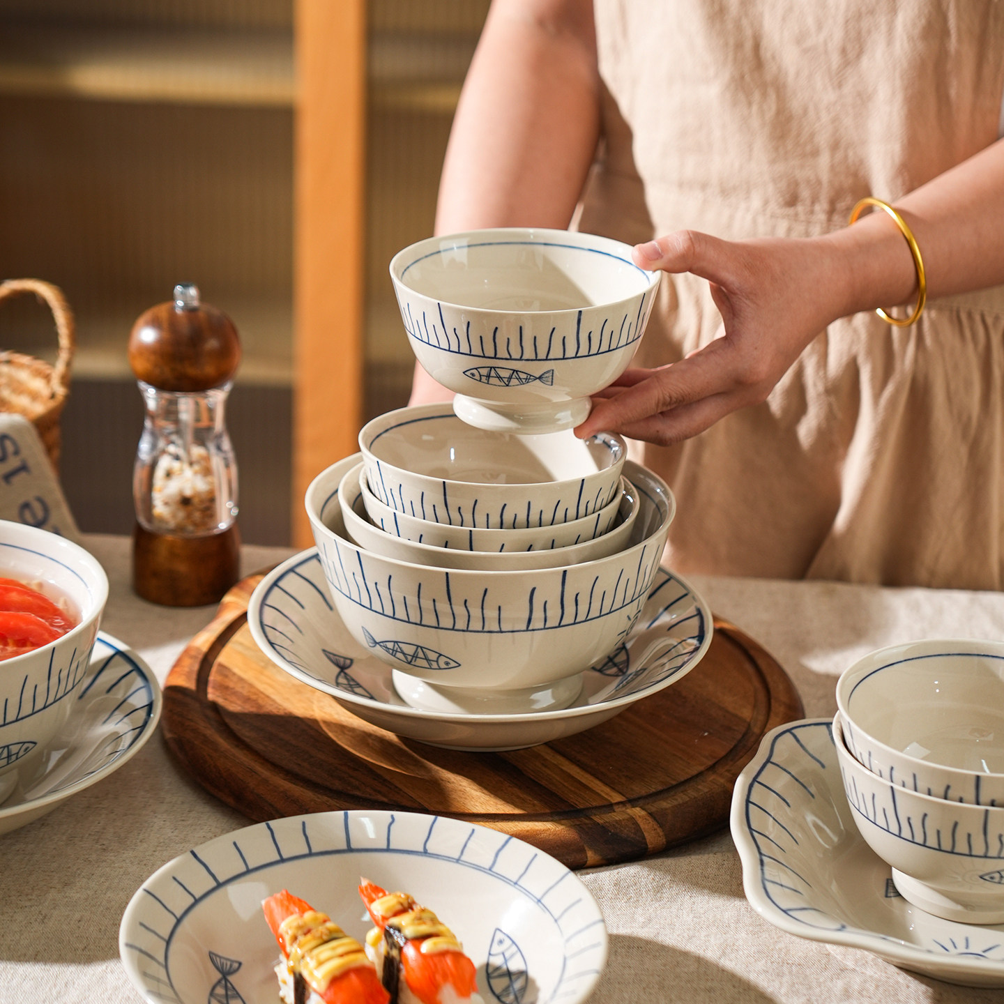 舍里年年有鱼家用陶瓷米饭碗餐具釉下彩碗盘碗碟套装小碗菜盘餐盘