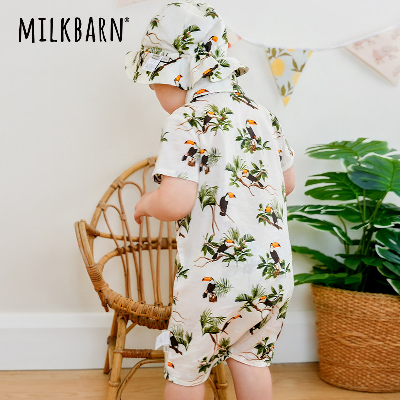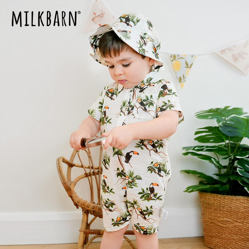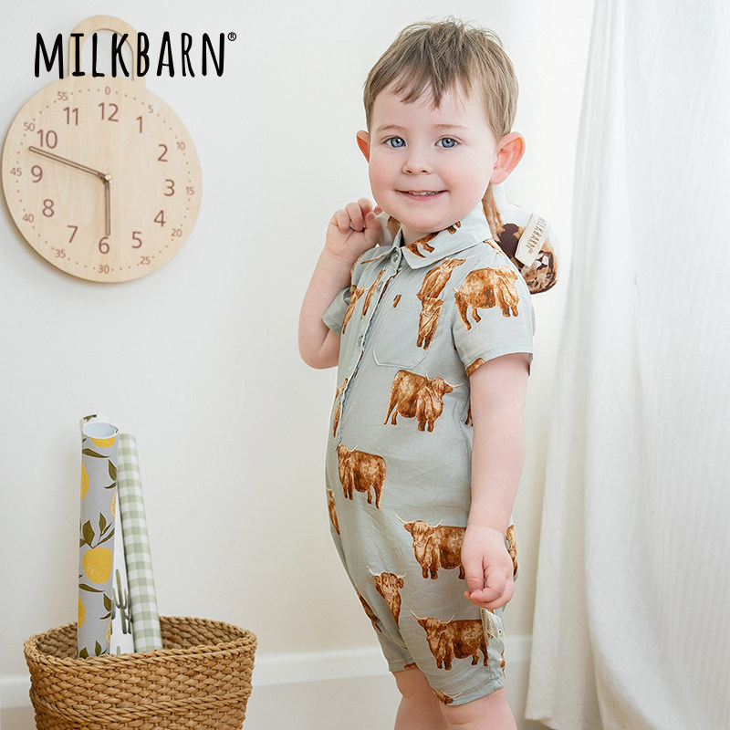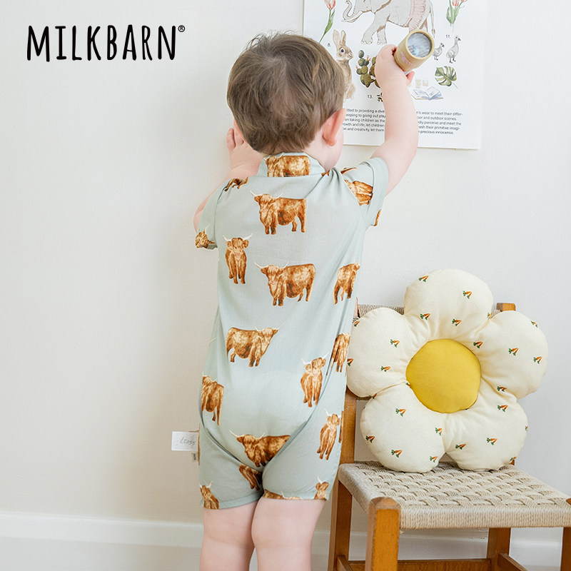 Milkbarn2025春夏新品婴儿衬衫连体衣服宝宝短袖短裤哈衣纯棉爬服