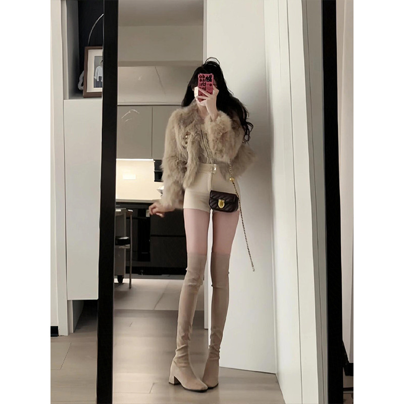 羊皮版~内增高靴子女2025新款爆款中筒粗跟短靴卡其色褶皱堆堆靴