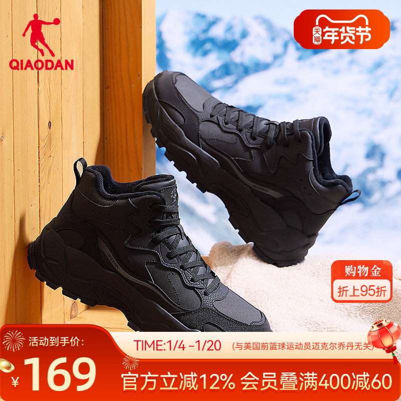 乔丹棉鞋男鞋2025冬季皮面防水高帮加绒保暖休闲鞋黑色户外运动鞋