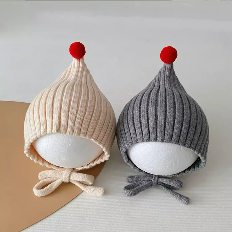 婴儿护耳帽秋冬季针织可爱球球尖尖小红帽防风保暖毛线宝宝精灵帽