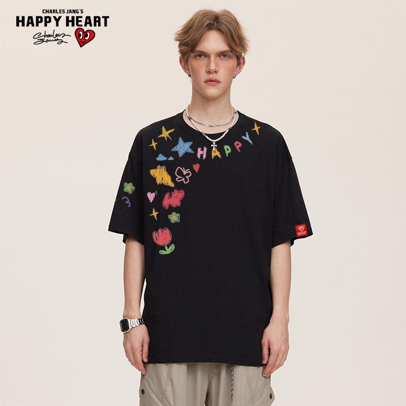 查尔斯桃心 夏季纯棉涂鸦印花宽松休闲情侣圆领百搭短袖T恤