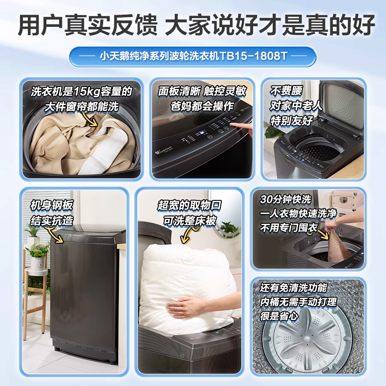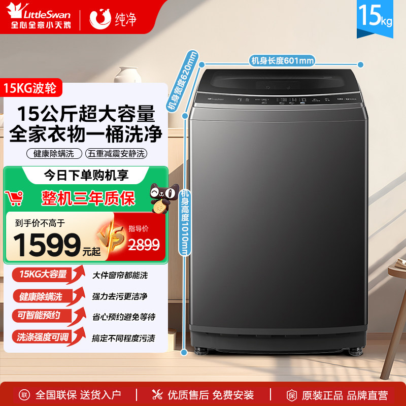 [纯净]小天鹅除螨波轮家用15KG大容量全自动洗衣机 TB15-1808T