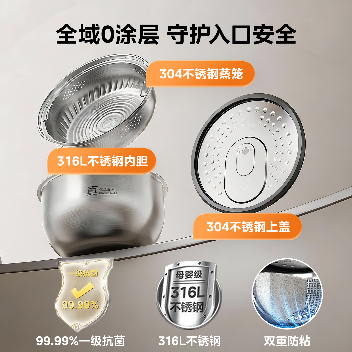 九阳0涂层电饭煲316L不锈钢内胆4-6人多功能低糖家用智能电饭锅