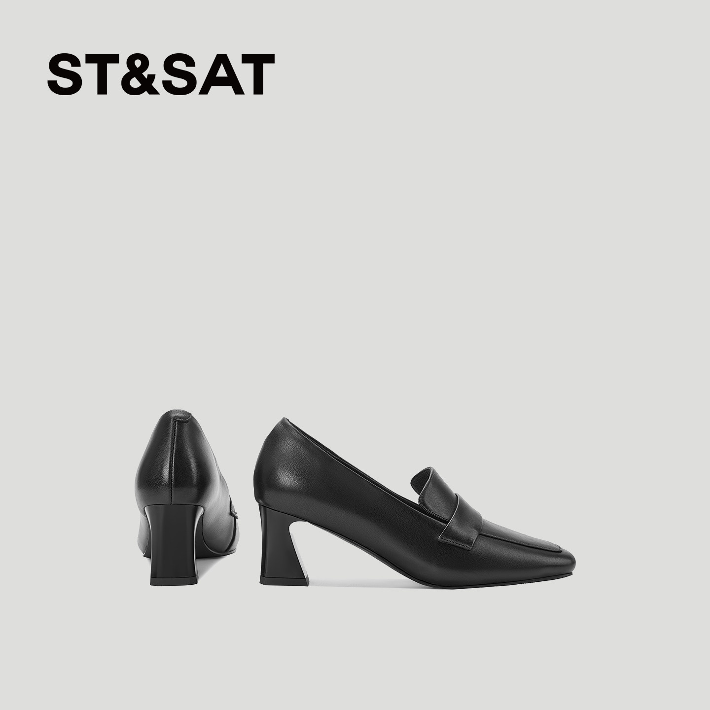 星期六高跟乐福鞋女新款头层羊皮杏色高跟鞋方头一脚蹬浅口女单鞋