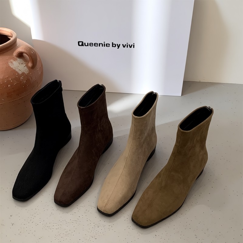 短靴女2025秋冬新款显瘦粗跟靴子法式弹力绒面瘦瘦靴女方头中跟