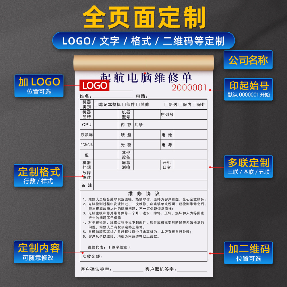 【电脑专用维修单】笔记本售后修理质保单数码上门检测回收受理单