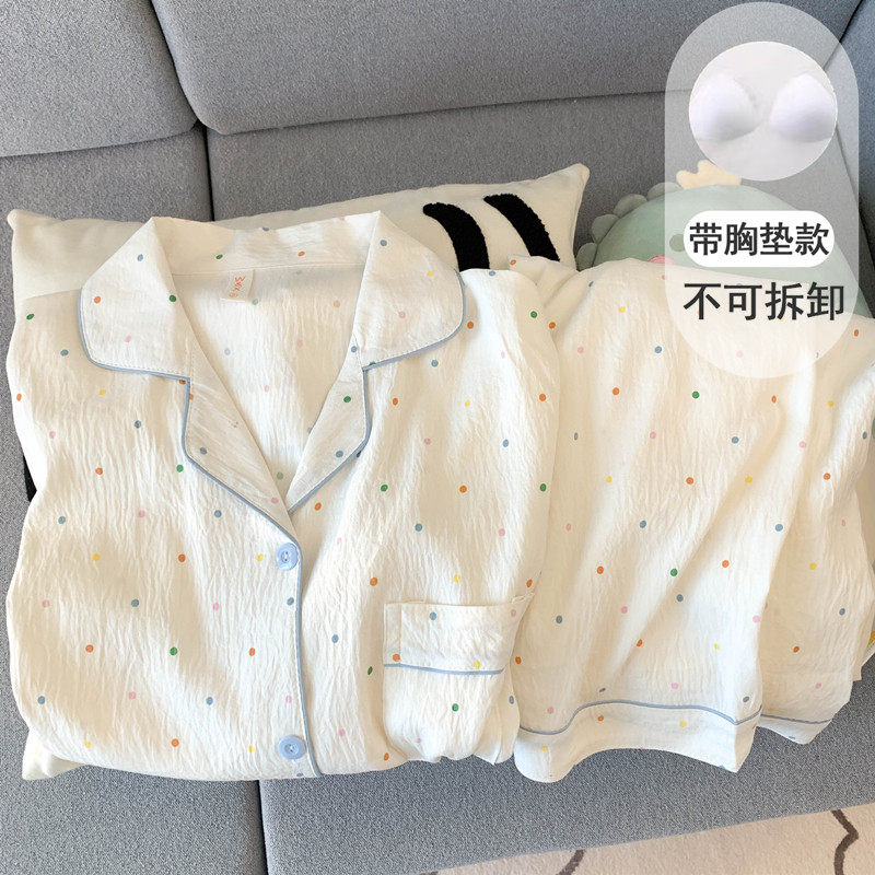 红豆带胸垫纯棉纱布睡衣女长袖长裤春秋款套装可爱小狗开衫家居服