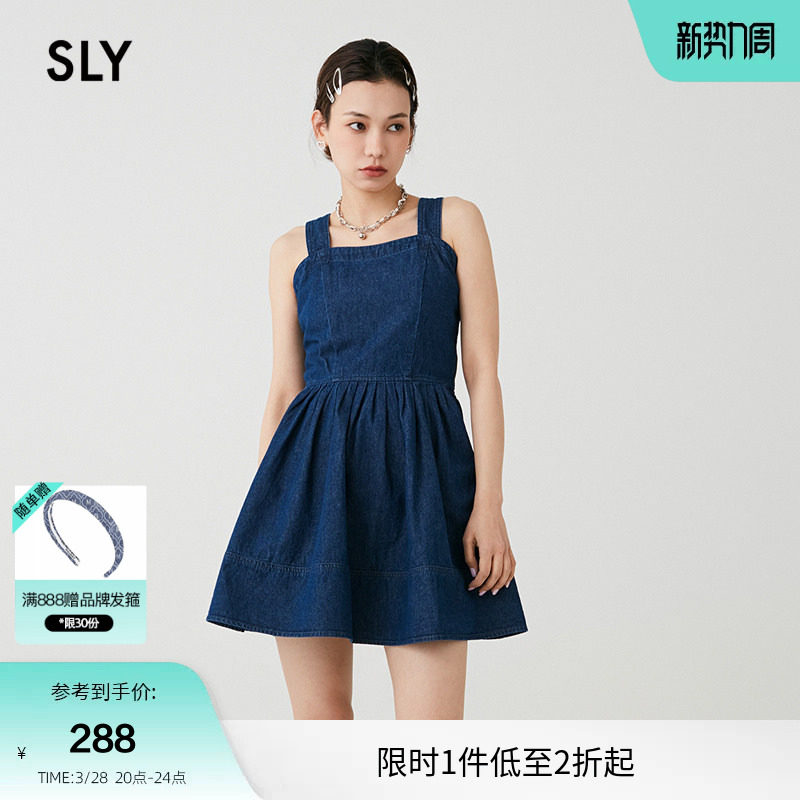 SLY 夏季复古丹宁港风捏褶牛仔吊带连衣裙038HSL13-0091